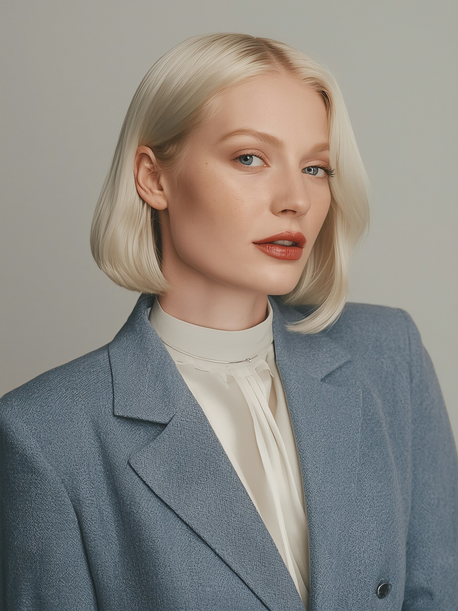 Portrait of a woman with blonde hair in a blue blazer and white blouse, showcasing a professional and elegant look.
