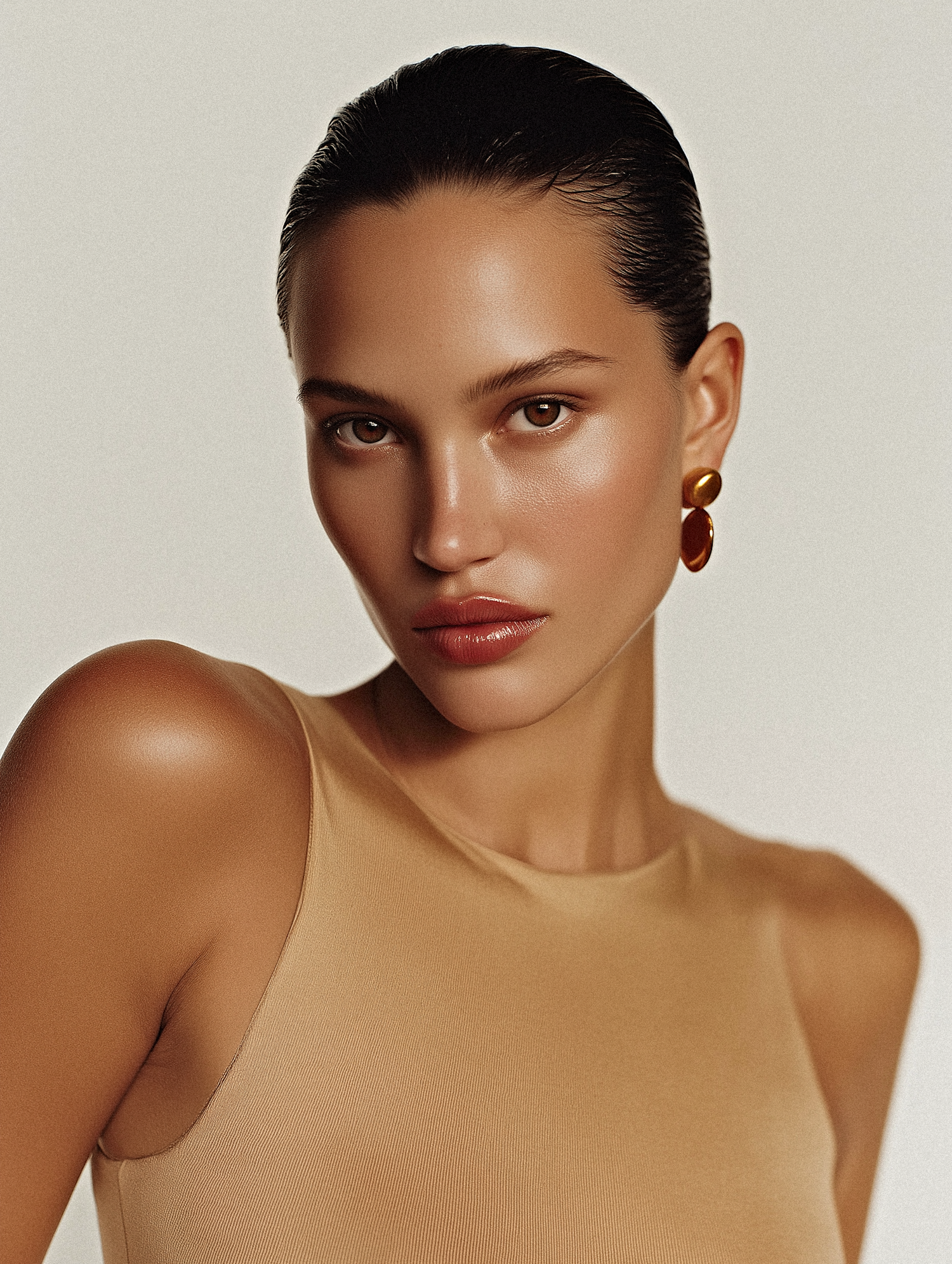 A striking portrait of a person with sleek hair, gold earrings, and a beige top, set against a neutral background.