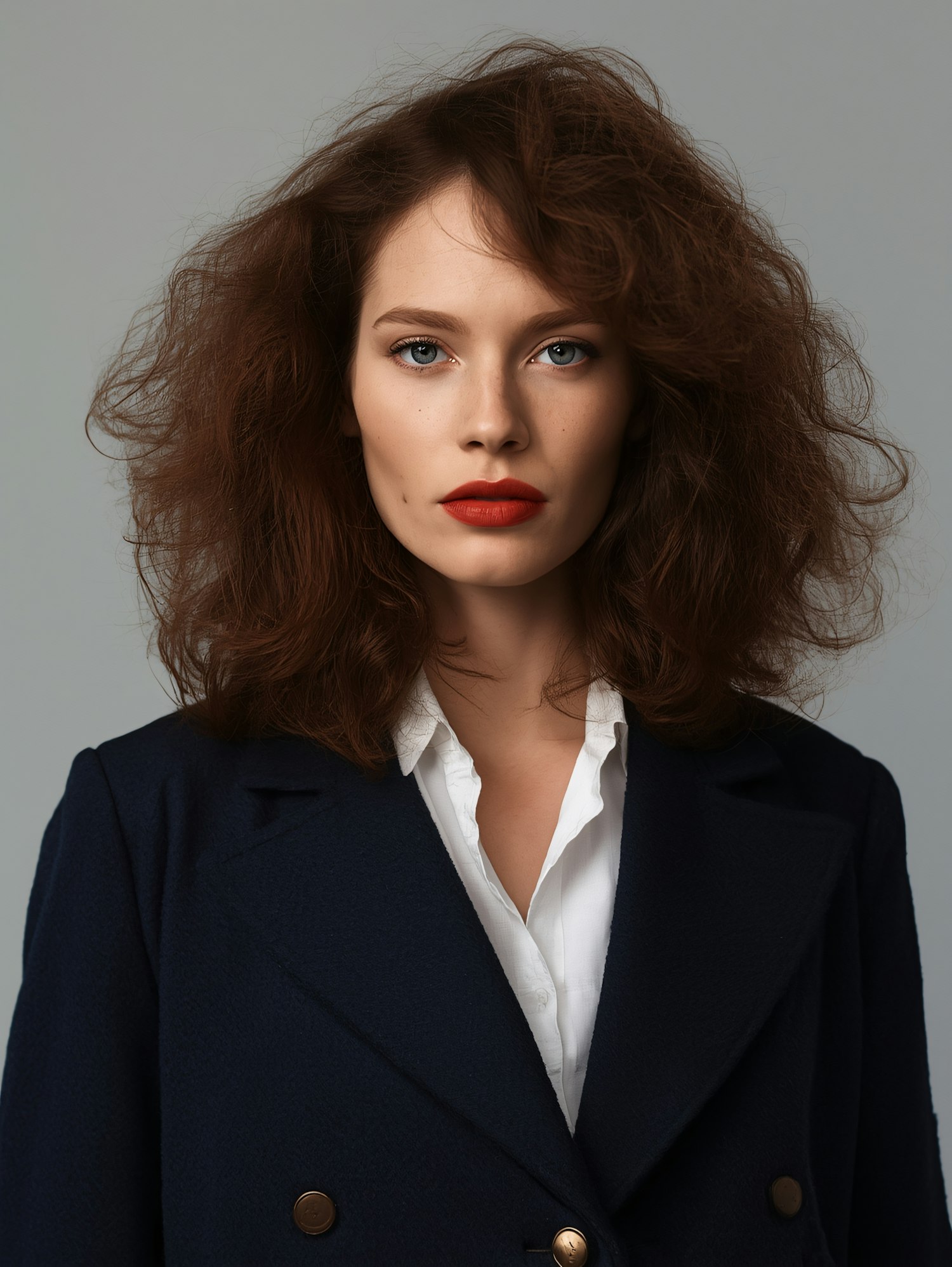 Portrait of a woman with voluminous brown hair, blue eyes, and red lipstick, wearing a navy coat and white shirt against a gray background.