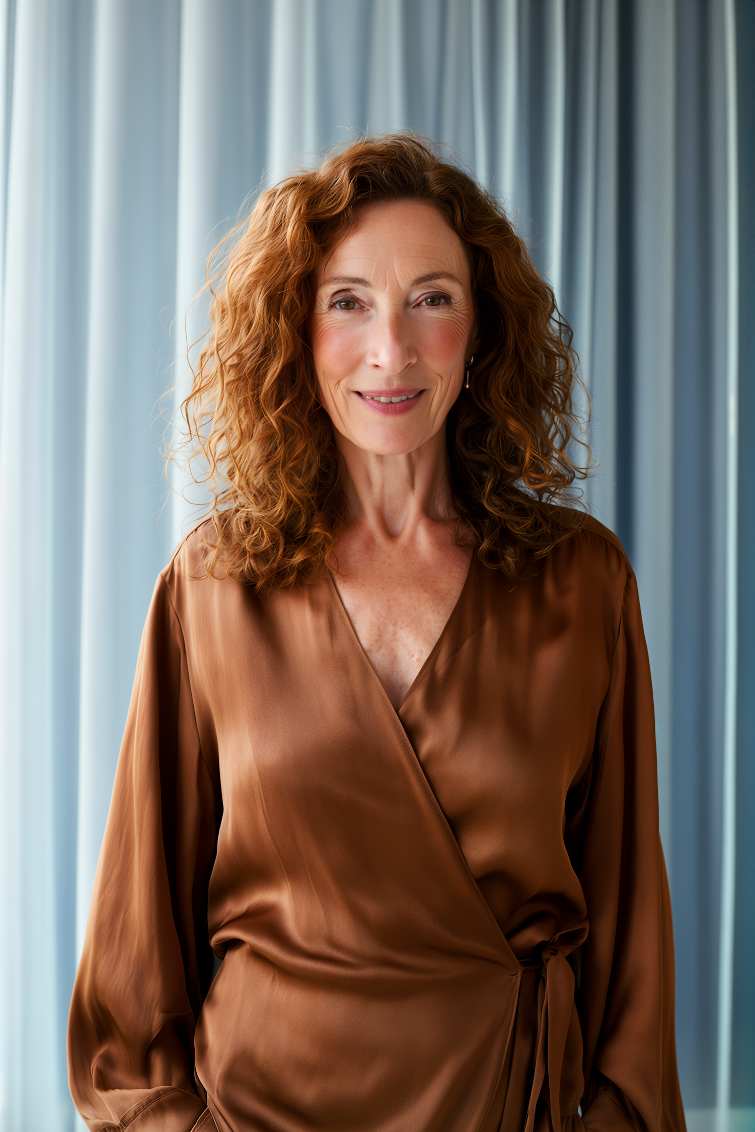 A woman with curly auburn hair in a silky brown blouse stands against soft blue curtains, exuding warmth and elegance.