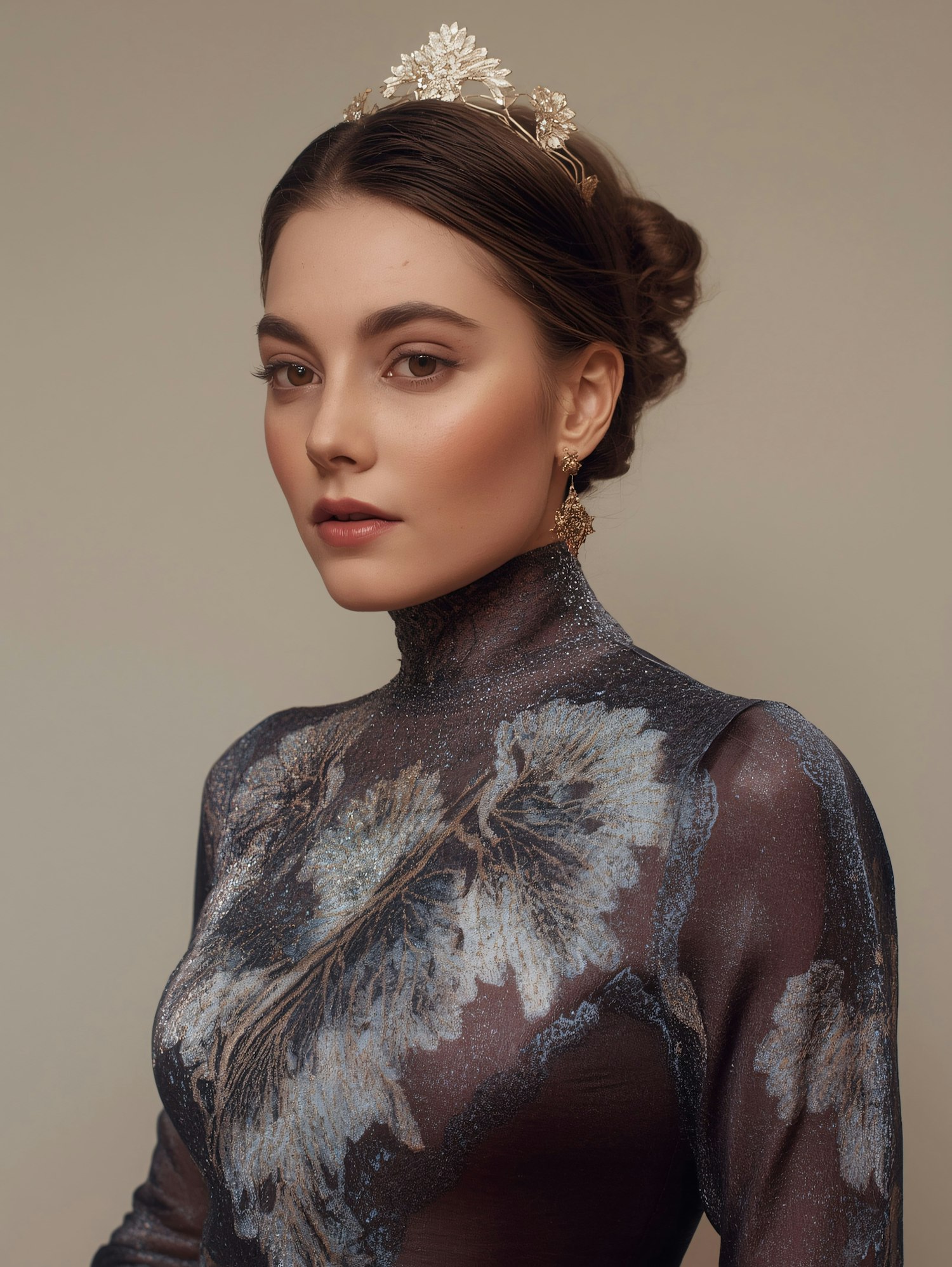 Elegant portrait of a woman in a floral crown and shimmering dress, showcasing refined beauty and intricate details.