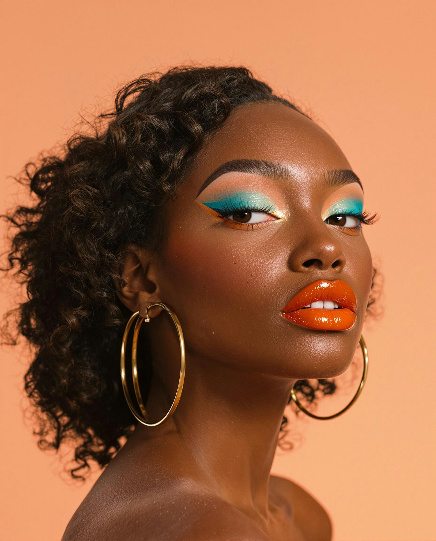 Close-up portrait of a woman with bold blue eye makeup, orange lips, and gold hoop earrings, set against a peach background.