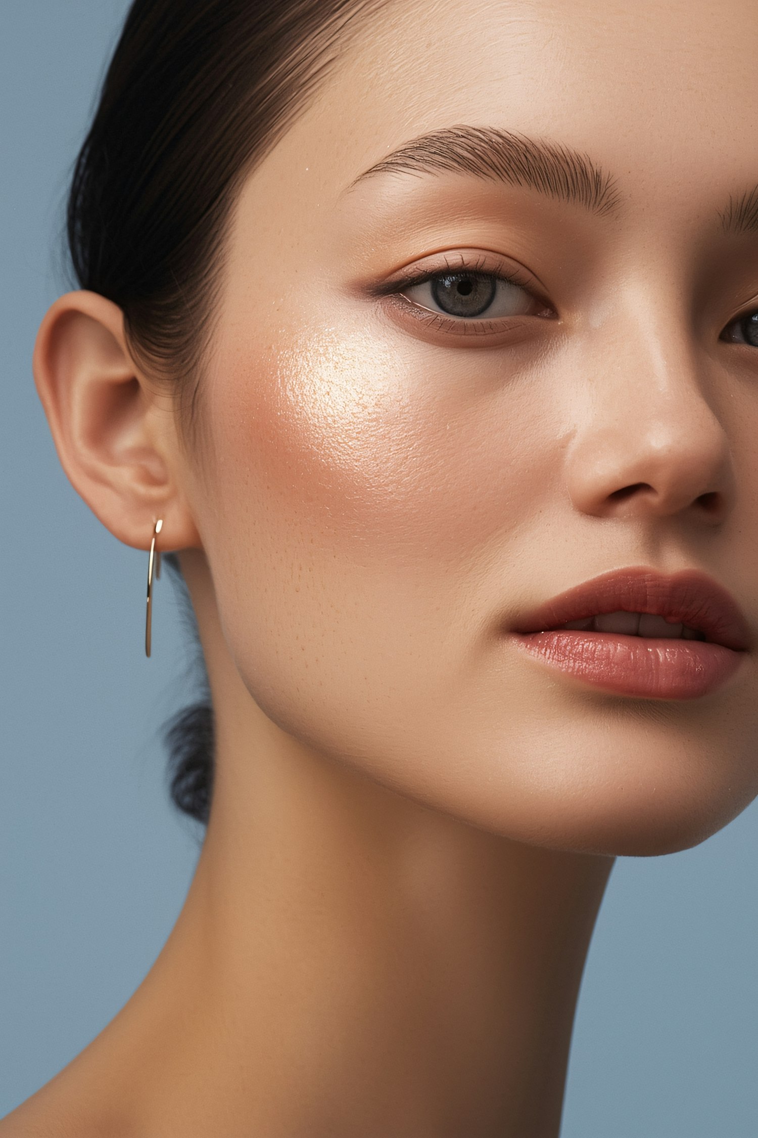 Close-up of a person with glowing skin, subtle makeup, and minimalist gold earring against a light blue background.
