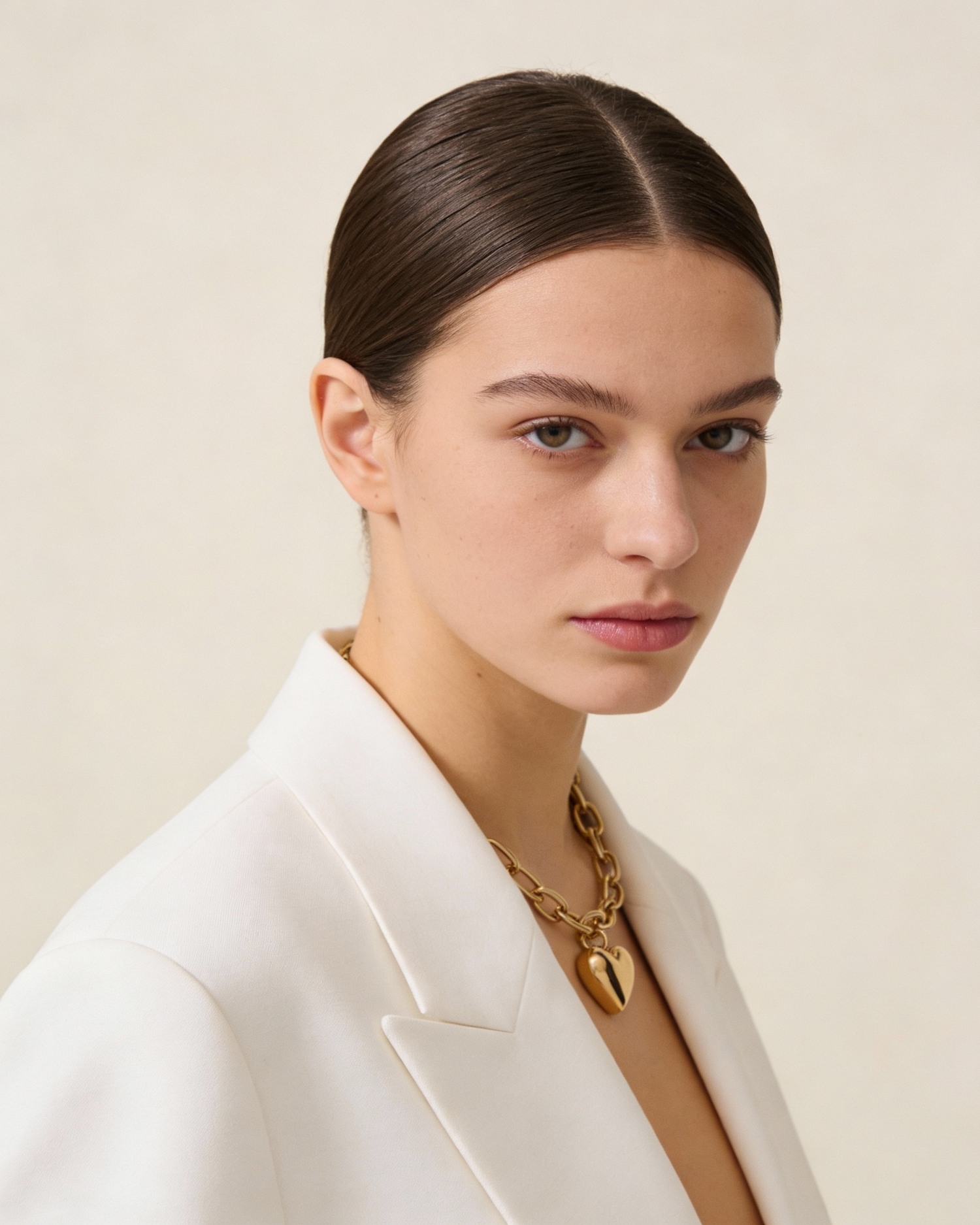 A person in a white blazer and gold heart necklace, with sleek hair and a neutral background, showcasing minimalist elegance.