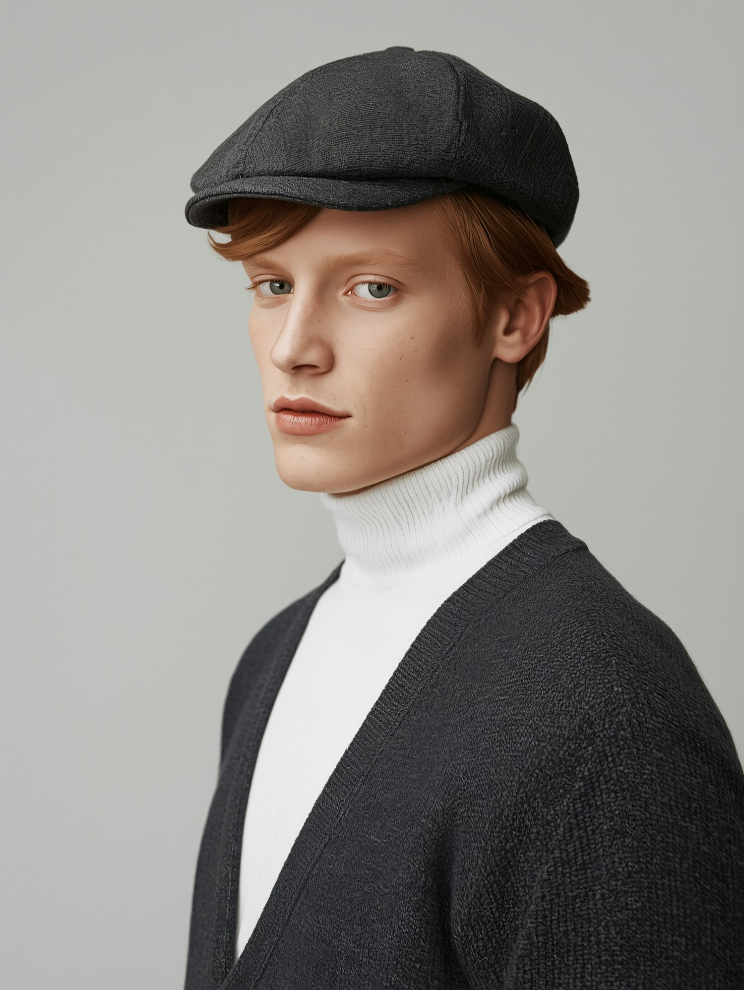 A stylish individual wearing a gray flat cap, white turtleneck, and dark cardigan, set against a neutral background.