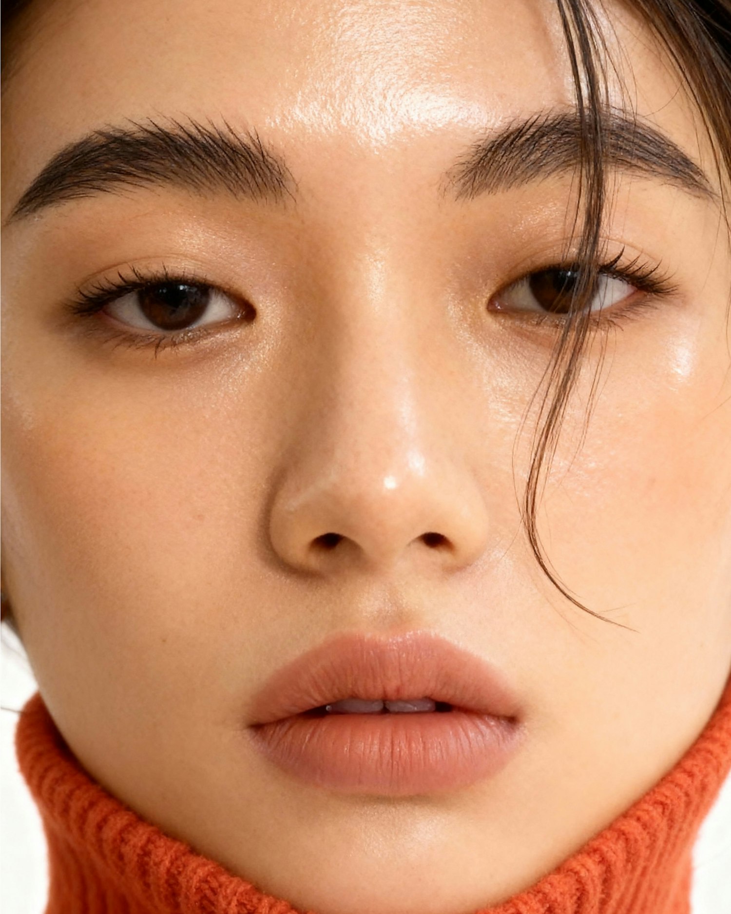 Close-up of a person with glowing skin, natural makeup, and an orange turtleneck, showcasing a serene and elegant expression.
