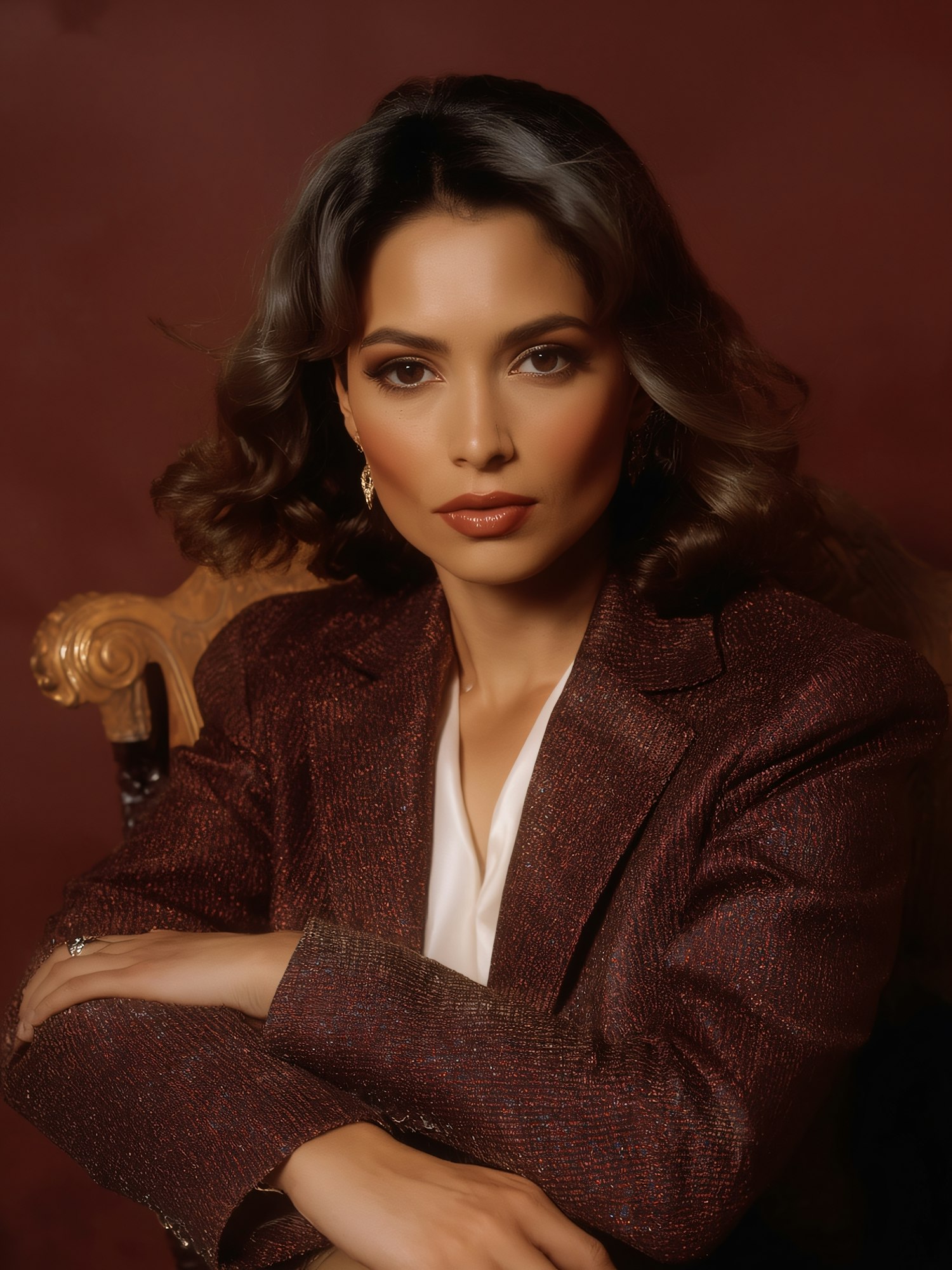 A poised woman in a maroon blazer with wavy hair and elegant accessories, set against a warm-toned background.