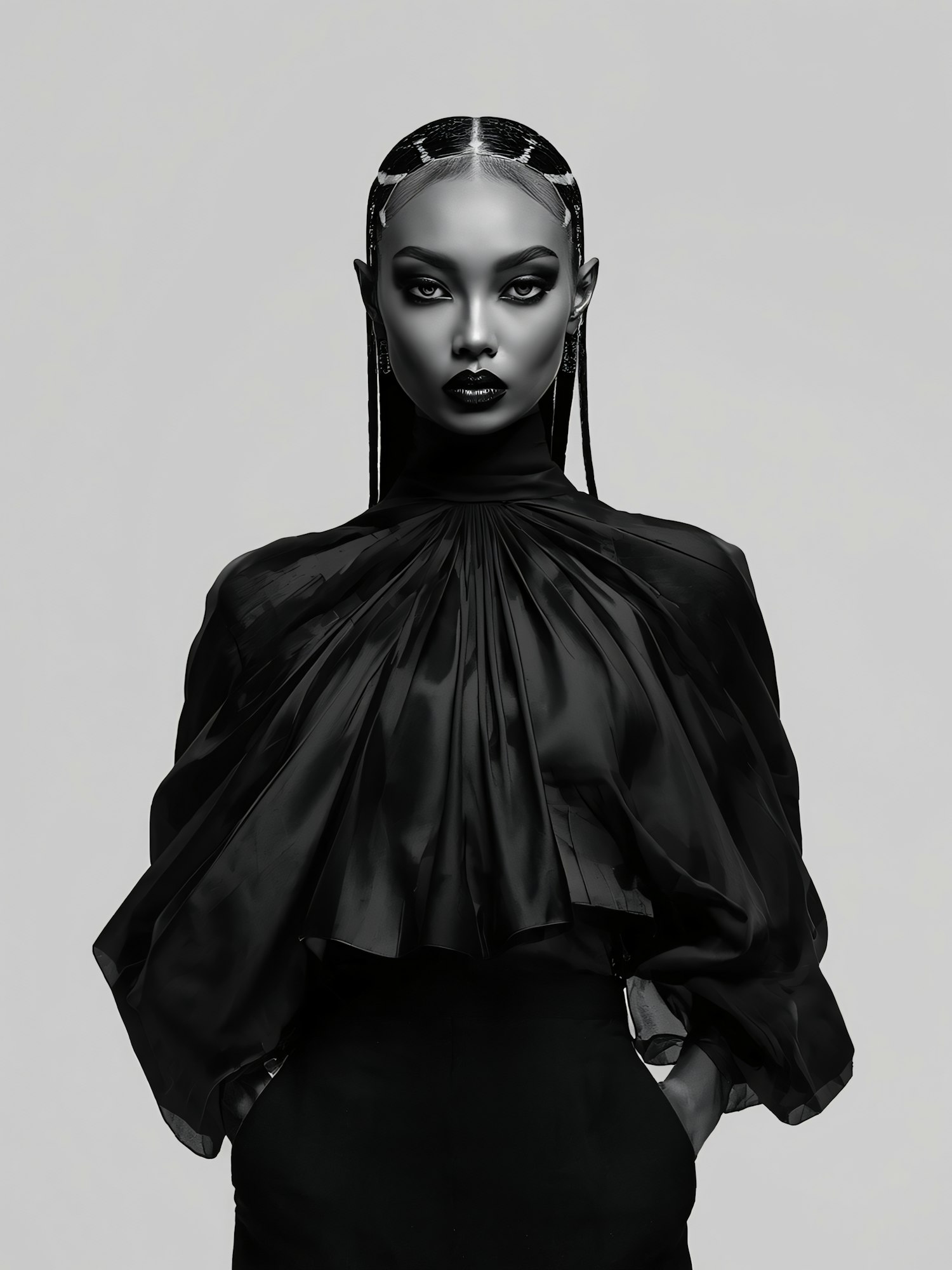 A bold and elegant portrait of a person in a flowing black outfit, styled with intricate braids and striking makeup, set against a neutral background.