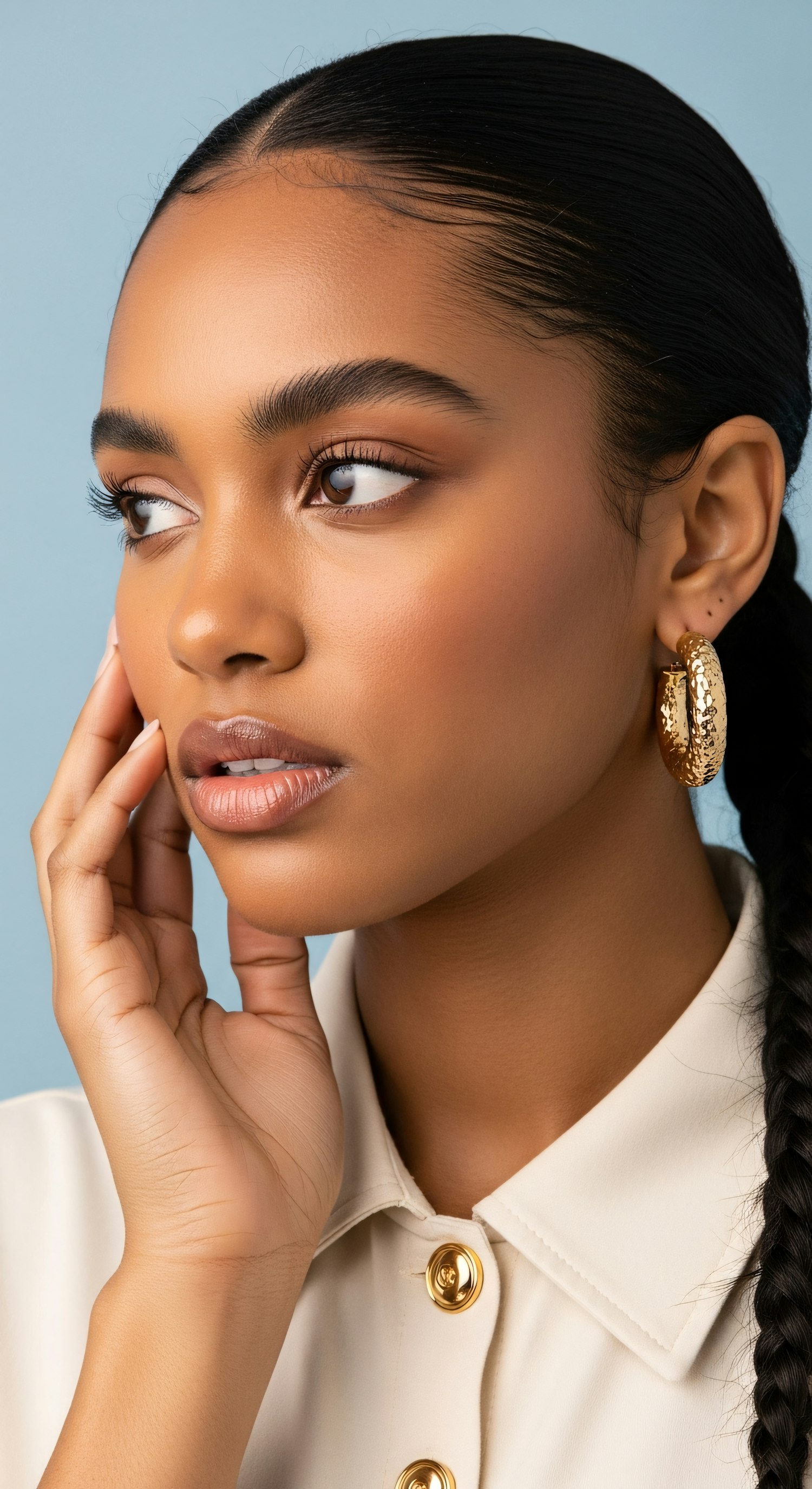 Close-up portrait of a stylish individual wearing gold hoop earrings and a cream shirt with golden buttons, set against a light blue background.