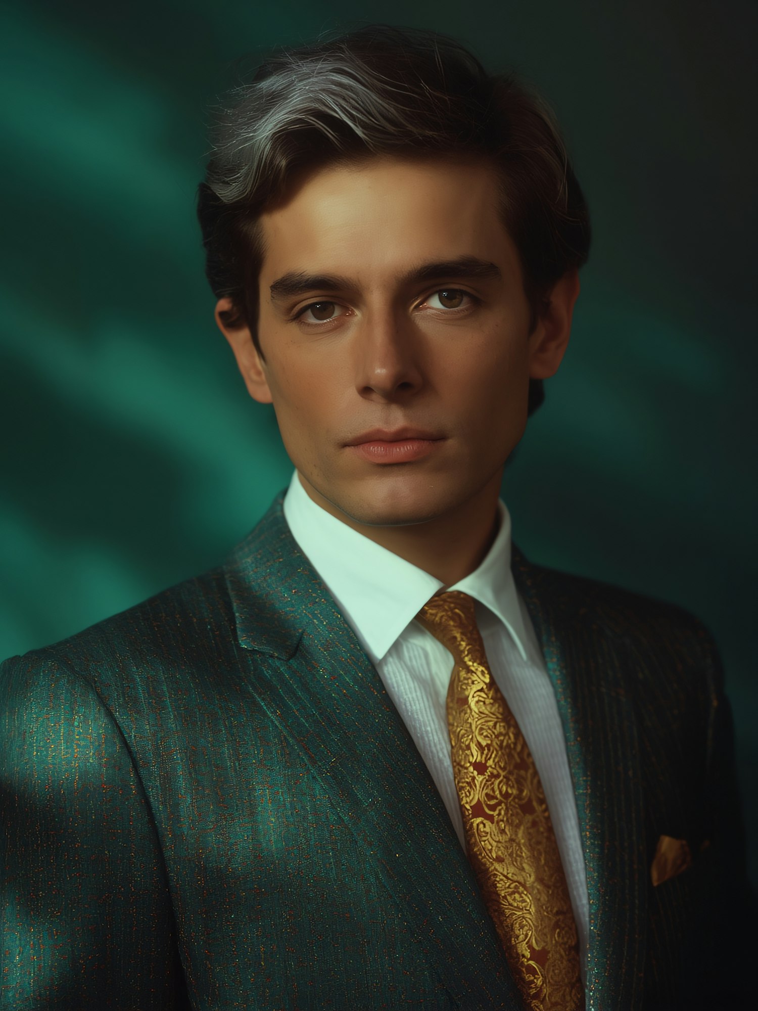 Portrait of a man in a teal suit and gold tie, with a composed expression and a softly lit green background.