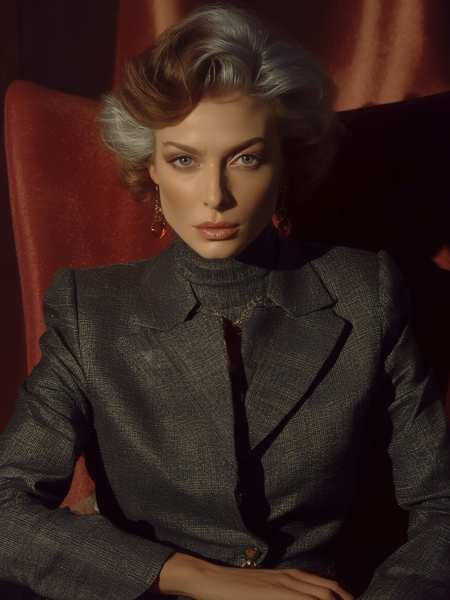 A person in a dark textured suit with styled hair and earrings, seated against a red backdrop with dramatic lighting.