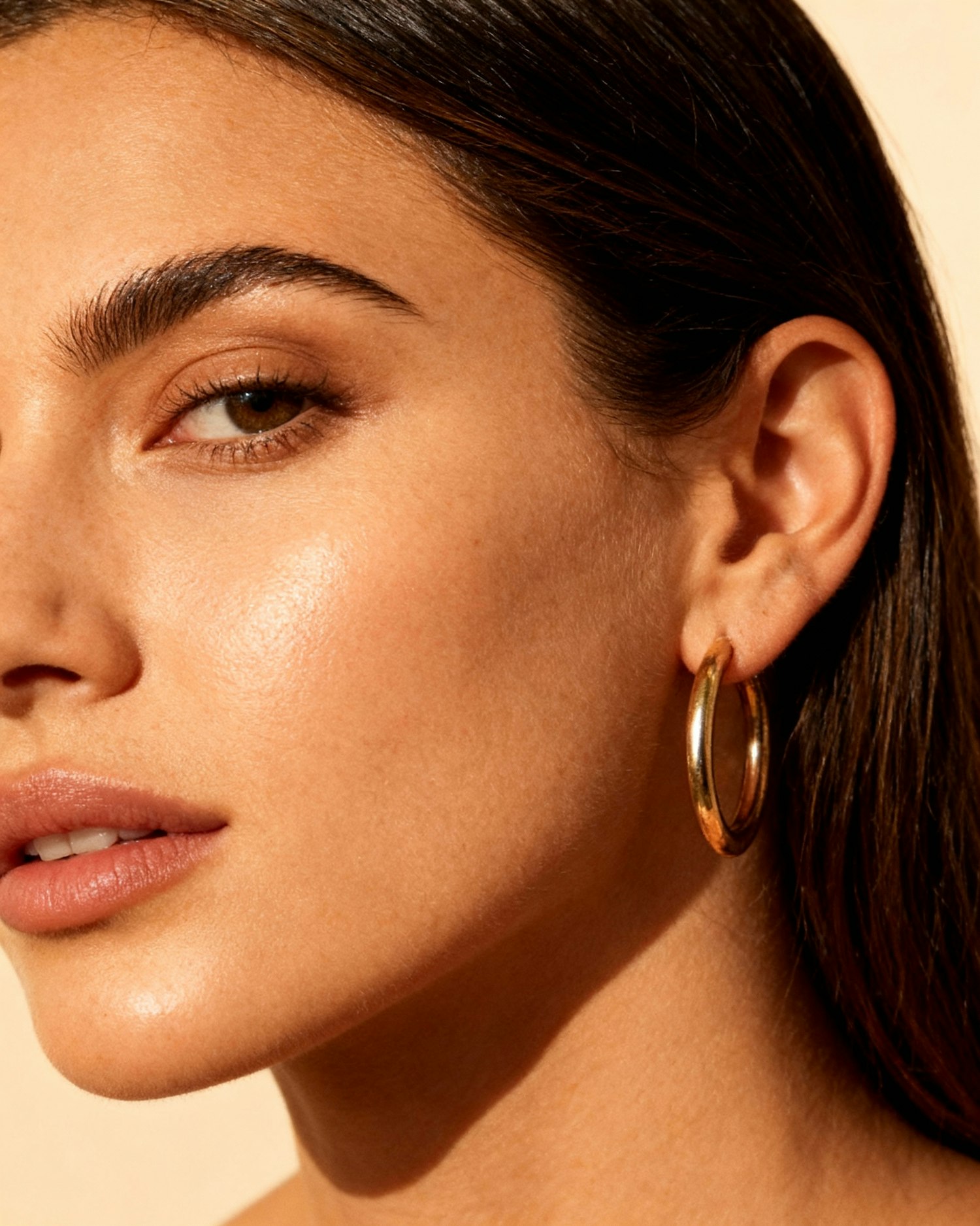Close-up of a person with glowing skin, brown eyes, and a gold hoop earring, set against a softly lit background.