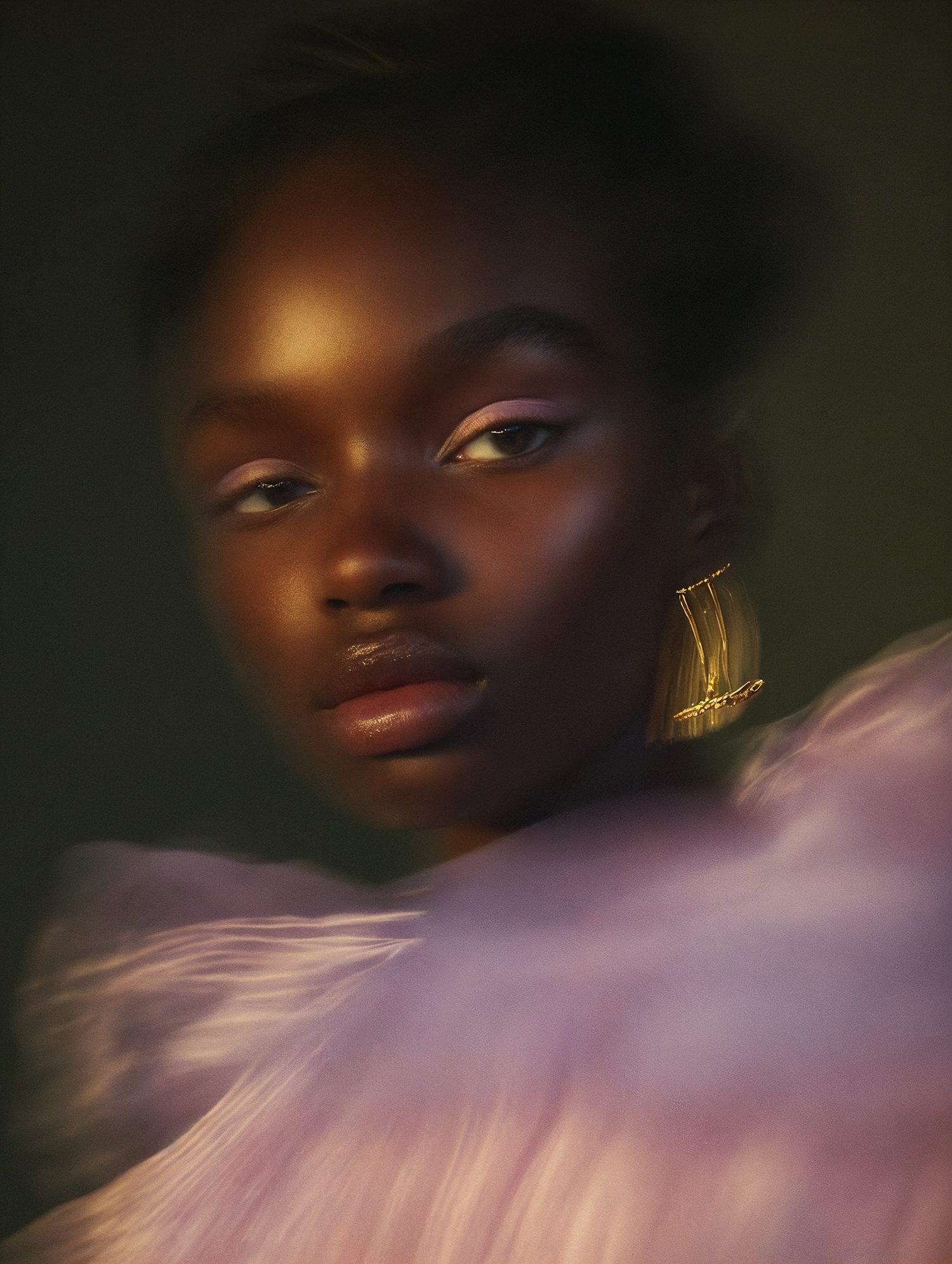 Close-up of a woman with glowing skin, pink eyeshadow, gold earrings, and lavender fabric, creating a dreamy, elegant vibe.