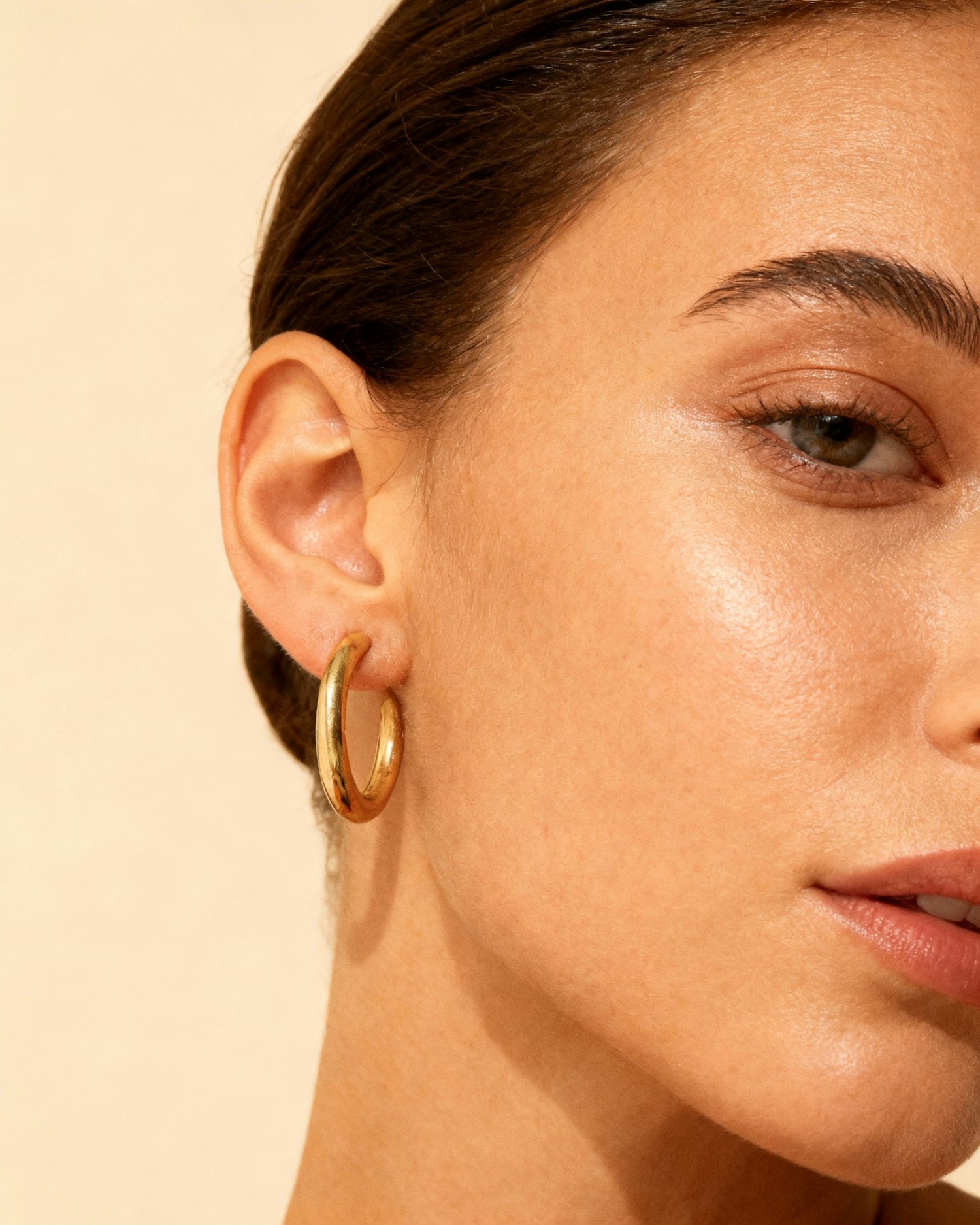 Close-up of a woman's face with a gold hoop earring, smooth skin, and a neutral background, highlighting elegance and simplicity.