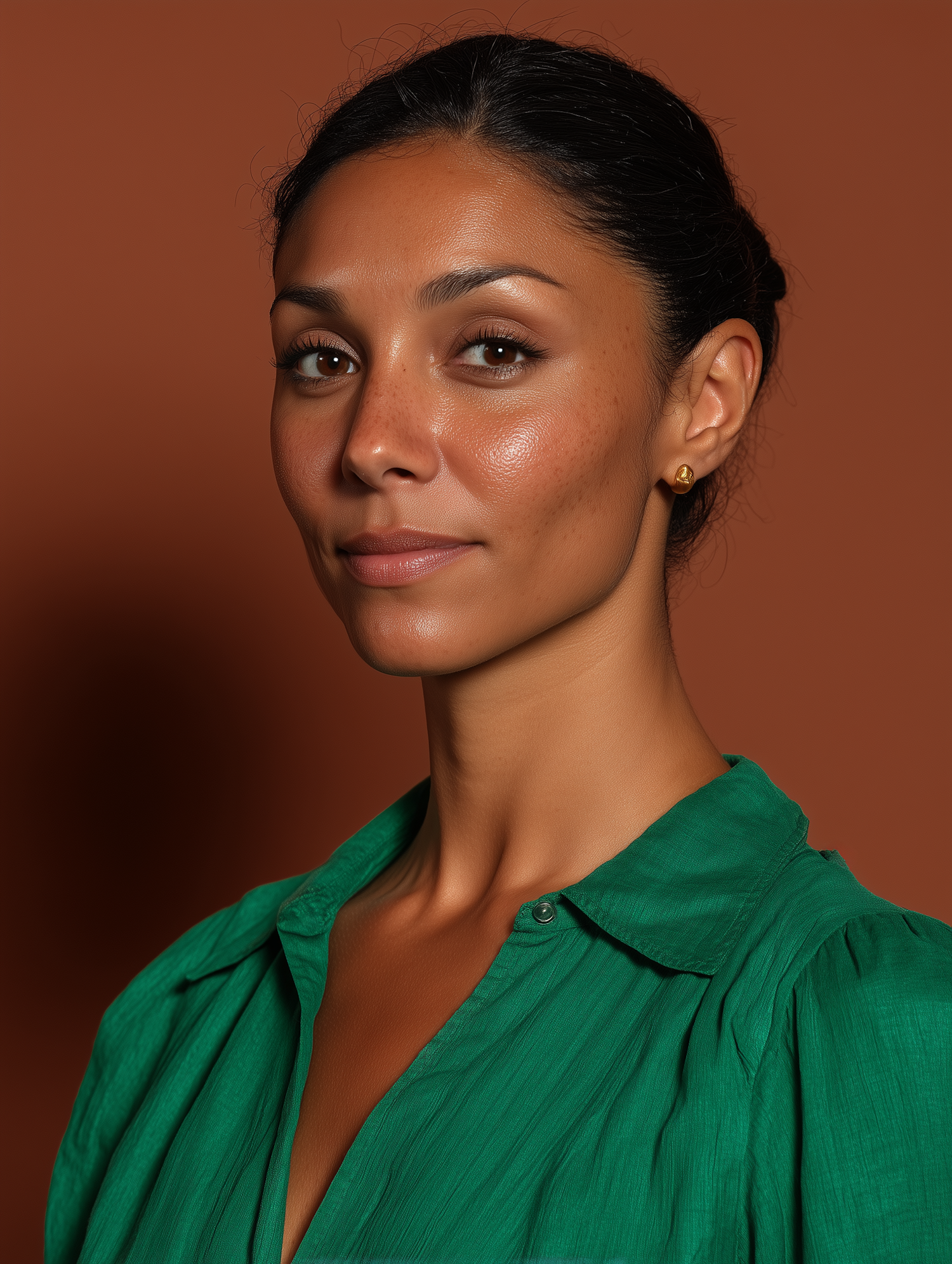 Portrait of a woman with medium brown skin, wearing a green blouse and gold earrings, set against a warm brown background.