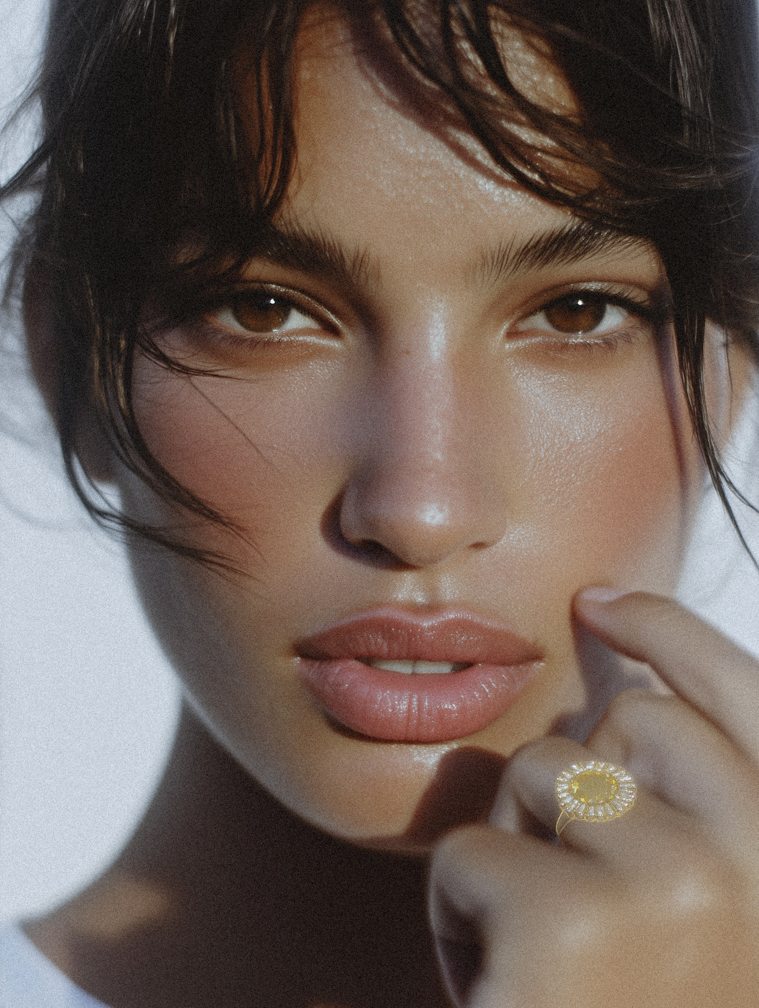 Close-up of a person with expressive features and a gold ring, showcasing natural beauty and elegance in soft lighting.