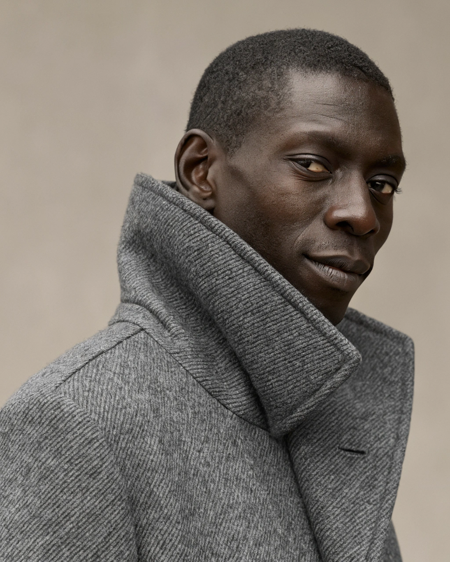 Close-up of a man in a gray high-collared wool coat, exuding calm confidence against a neutral beige background.