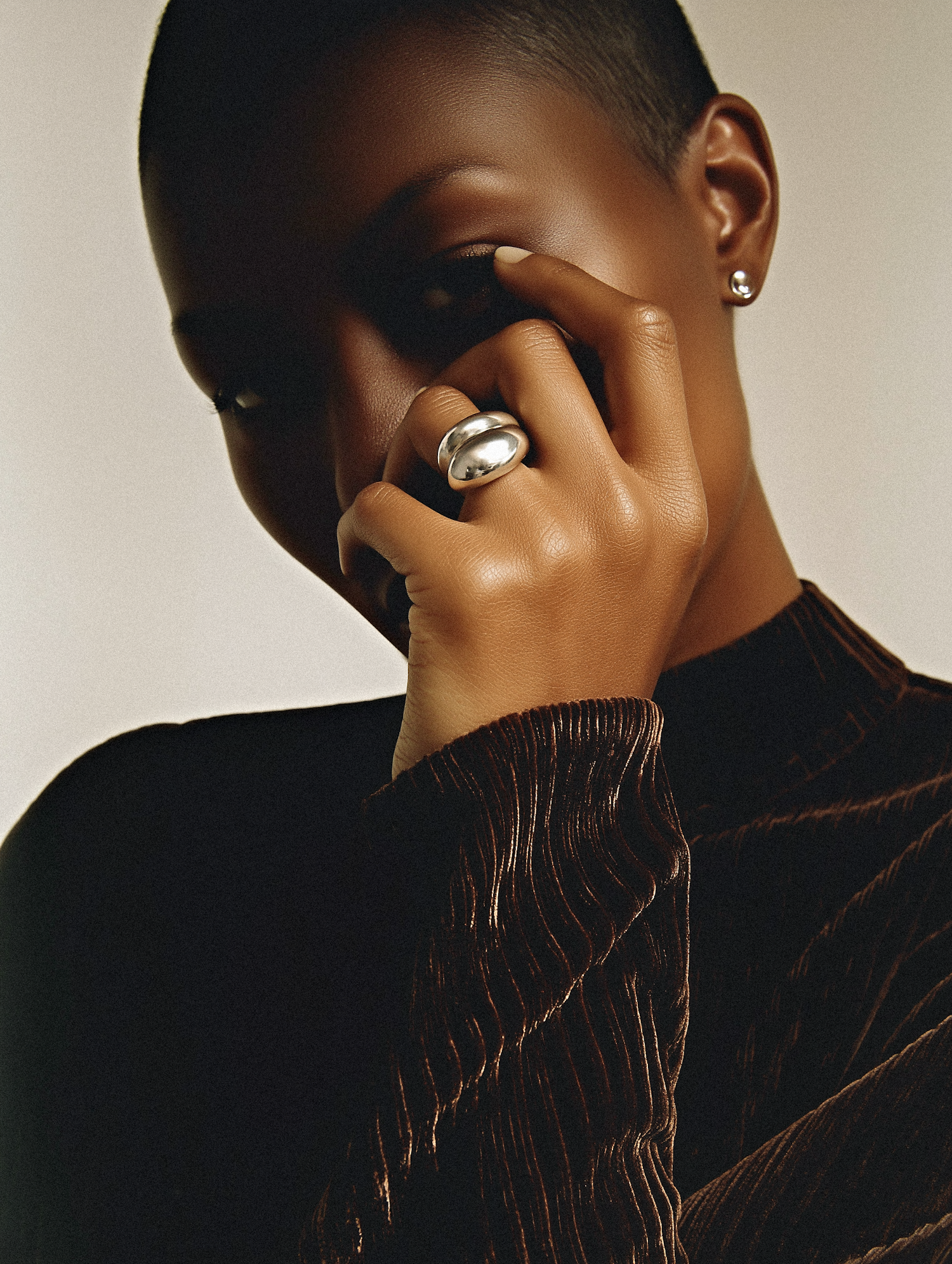 Close-up of a person with a shaved head, wearing a silver ring and textured dark clothing, captured in soft lighting.