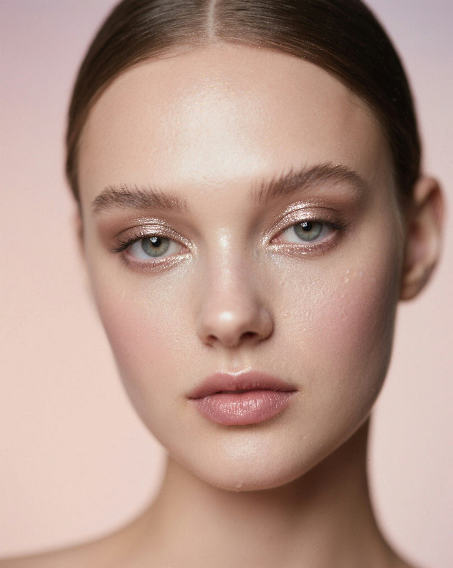 A beauty portrait of a model with dewy skin and minimalist metallic eye makeup against a muted pastel backdrop, soft focus, elegant simplicity, polished perfection.