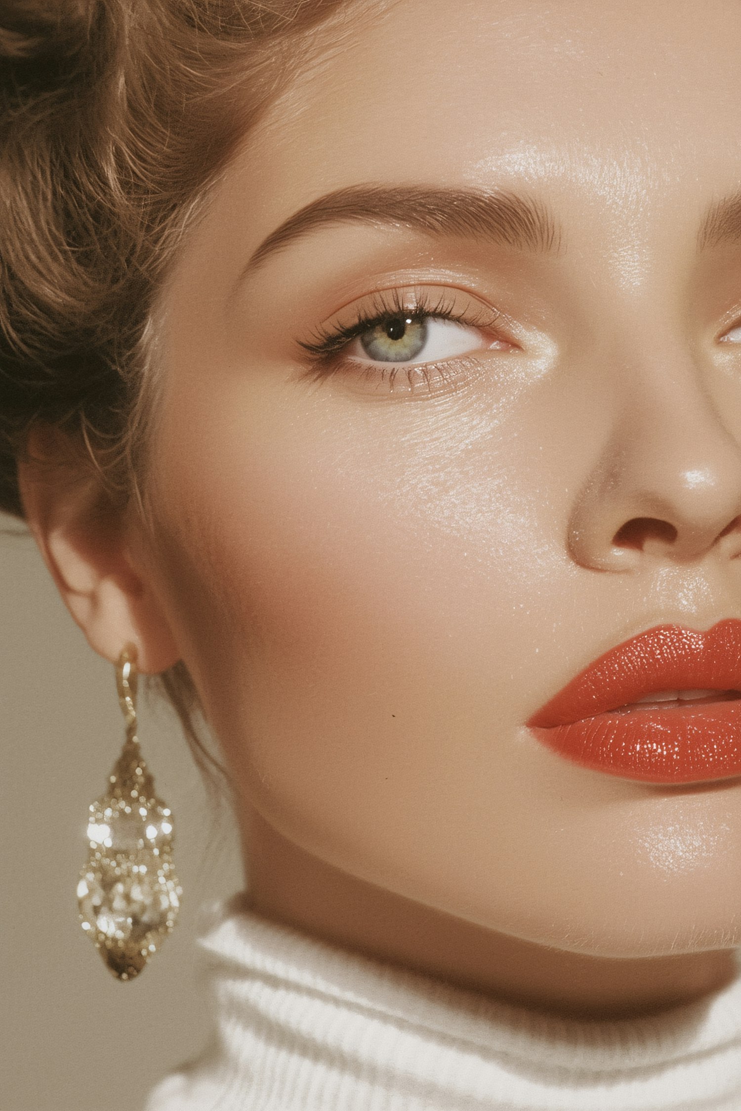 Close-up of a person with green eyes, red lipstick, and a gold earring, wearing a white turtleneck, showcasing elegant makeup and style.