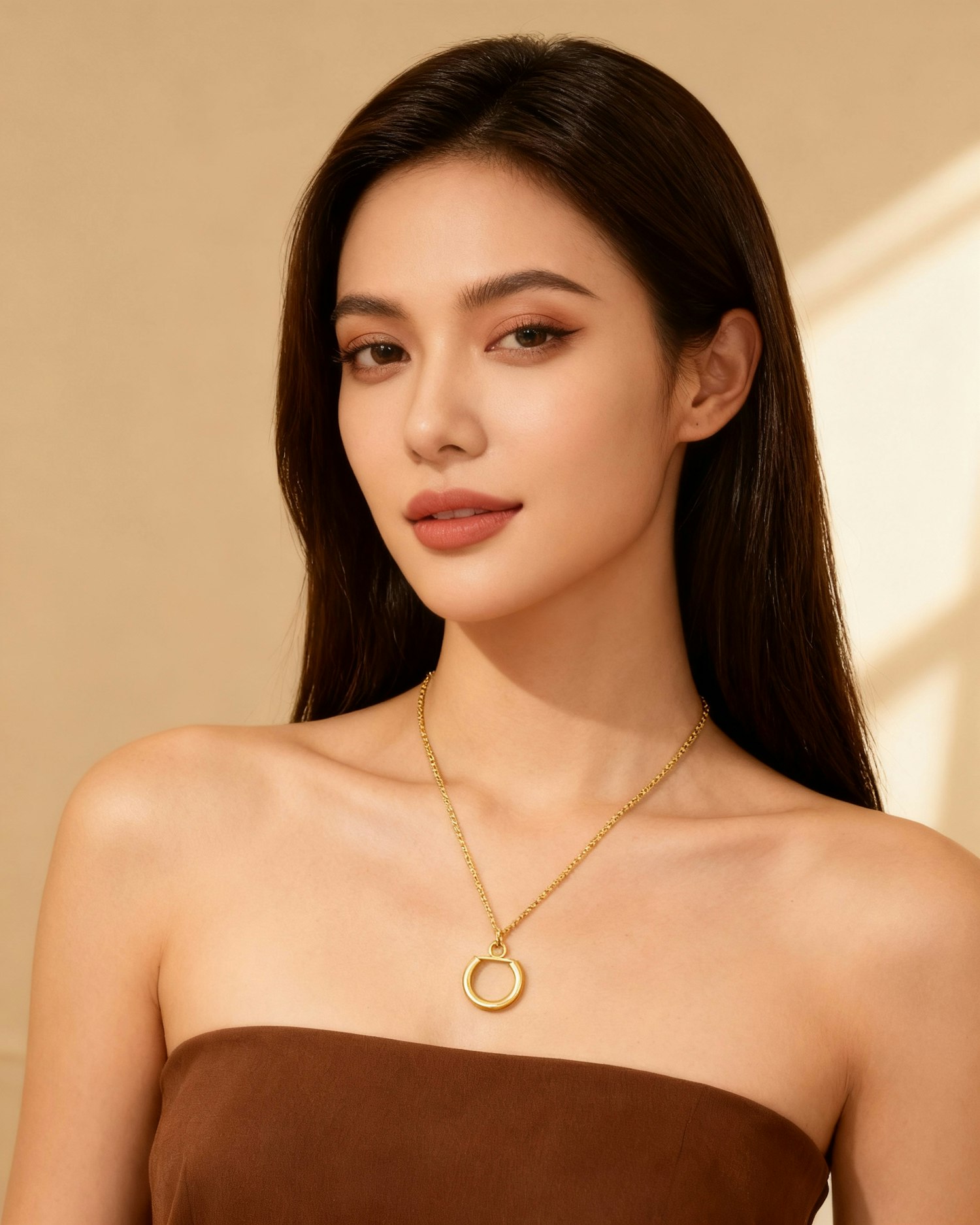 A woman with long dark hair, wearing a gold necklace and a brown strapless top, poses against a beige background with soft lighting.