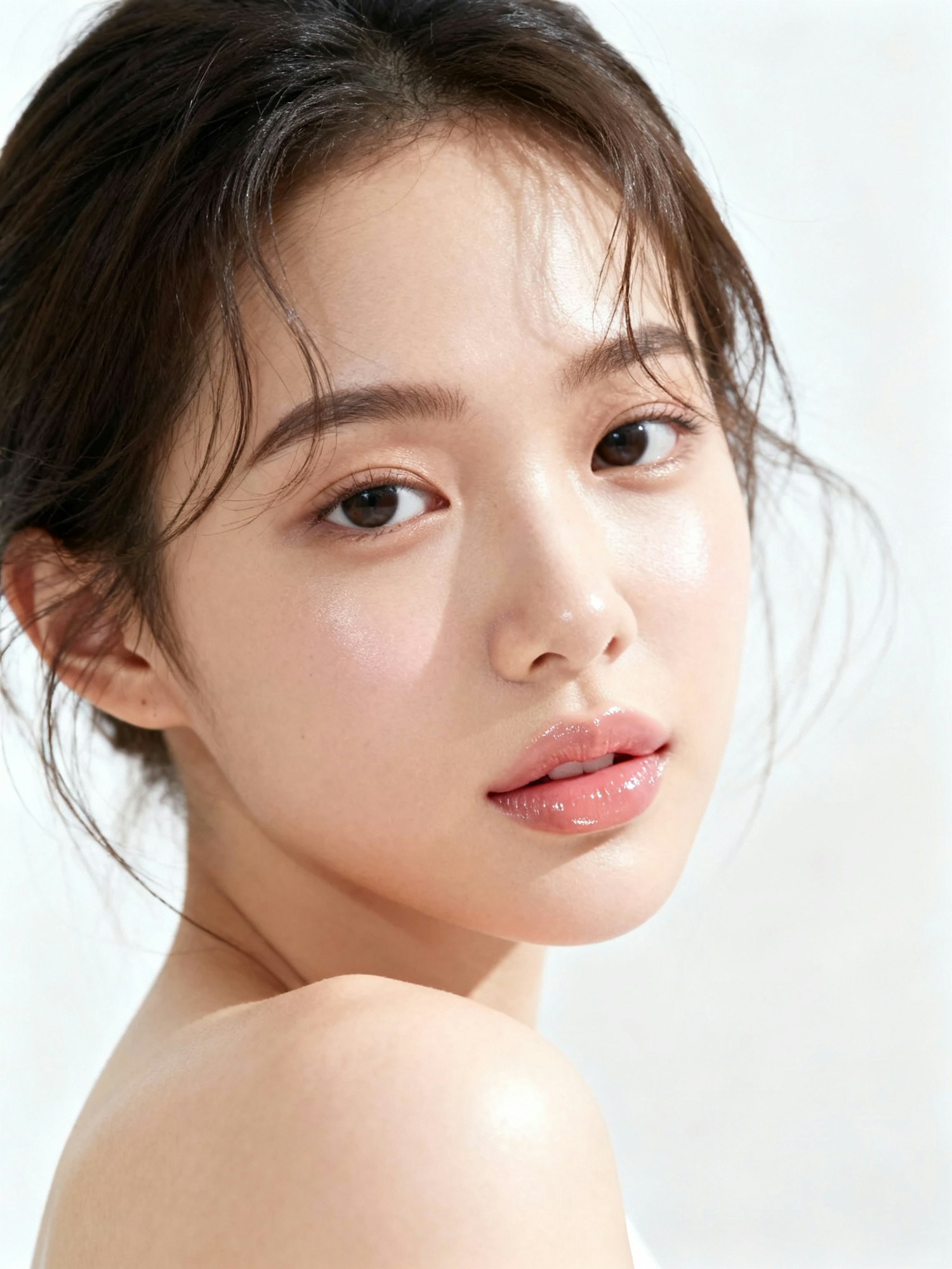 clean beauty campaign photography, minimalist white studio background, natural daylight with soft diffusion, high-end editorial lighting, focus on natural textures and radiant skin, no harsh shadows, aesthetic clean girl style, modern and feminine mood, inspired by Glossier and Summer Fridays campaigns, ultra-realistic, photographic rendering, professional studio shot — young woman in three-quarter angle, lips glowy and soft, minimal natural makeup, delicate highlights on cheekbones and lips, serene expression, hair slightly tousled, skin texture visible and realistic, overall bright and airy feel