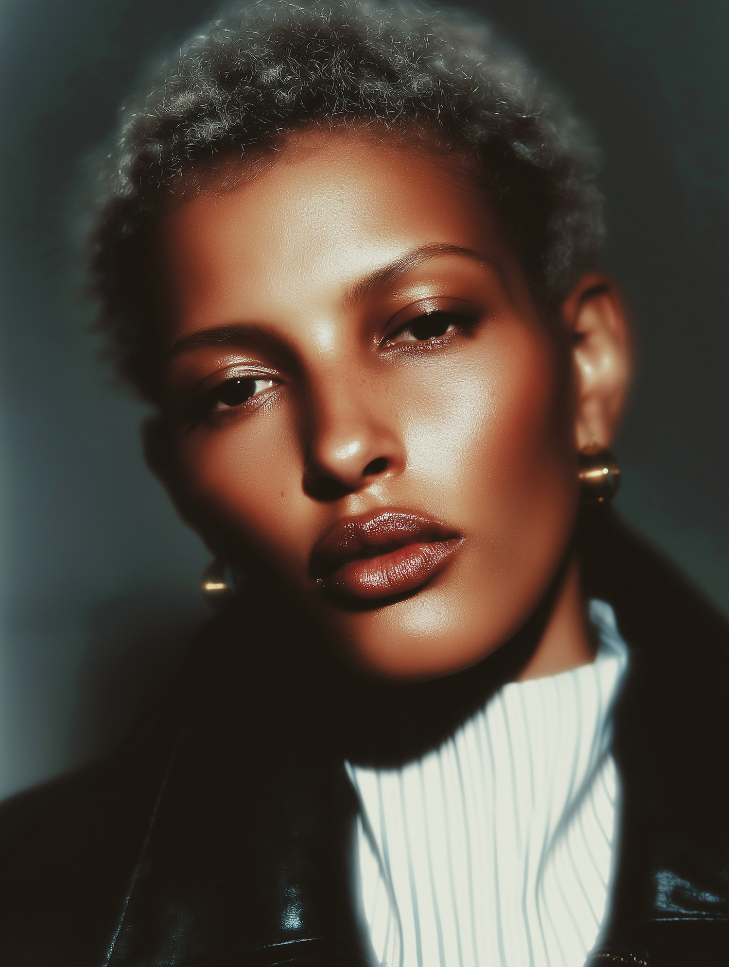 A striking portrait of an individual with short gray hair, wearing a leather jacket; bold lips and confident stance.