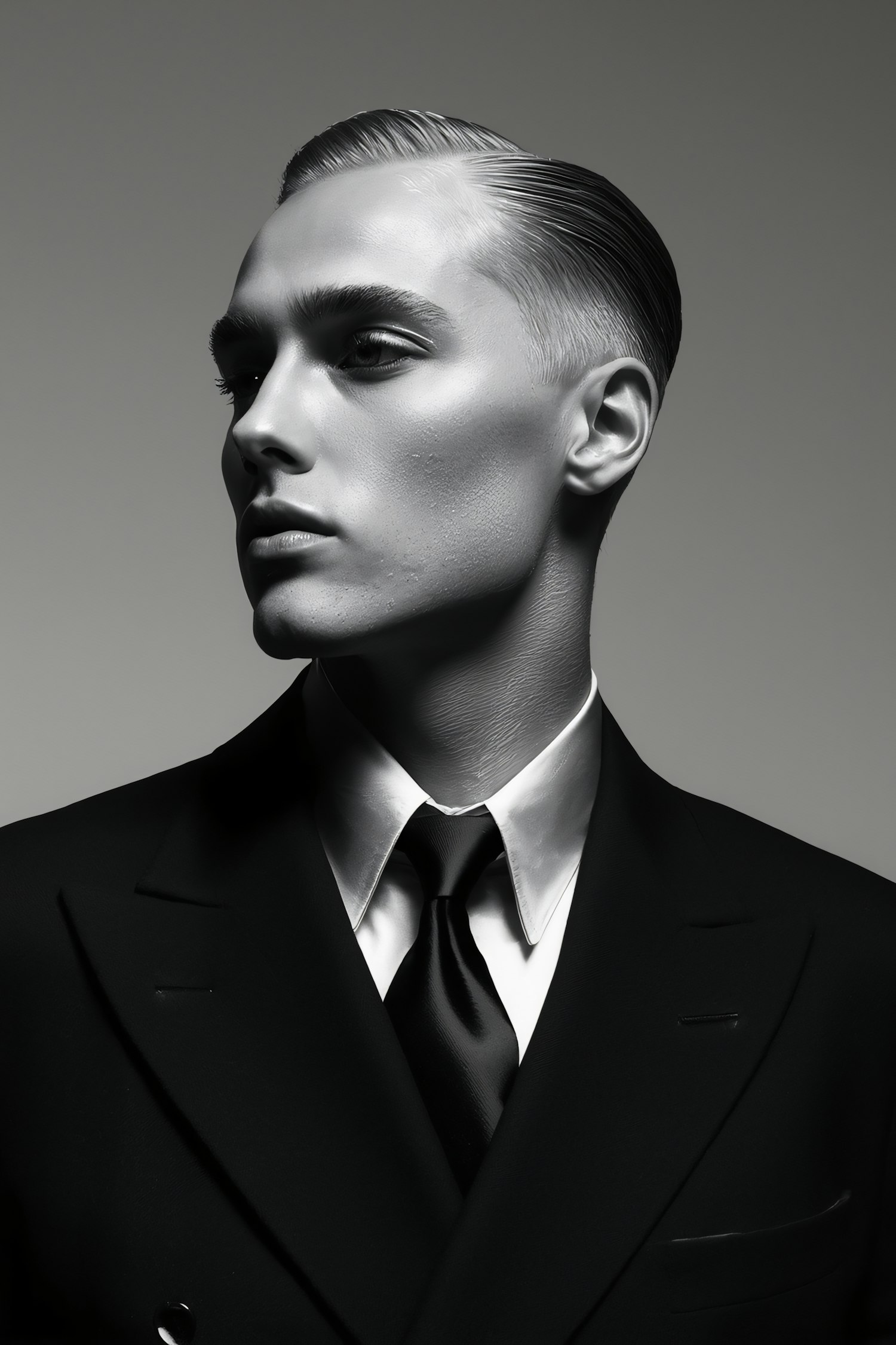 Monochrome portrait of a person in a formal suit, showcasing sharp features and dramatic lighting.