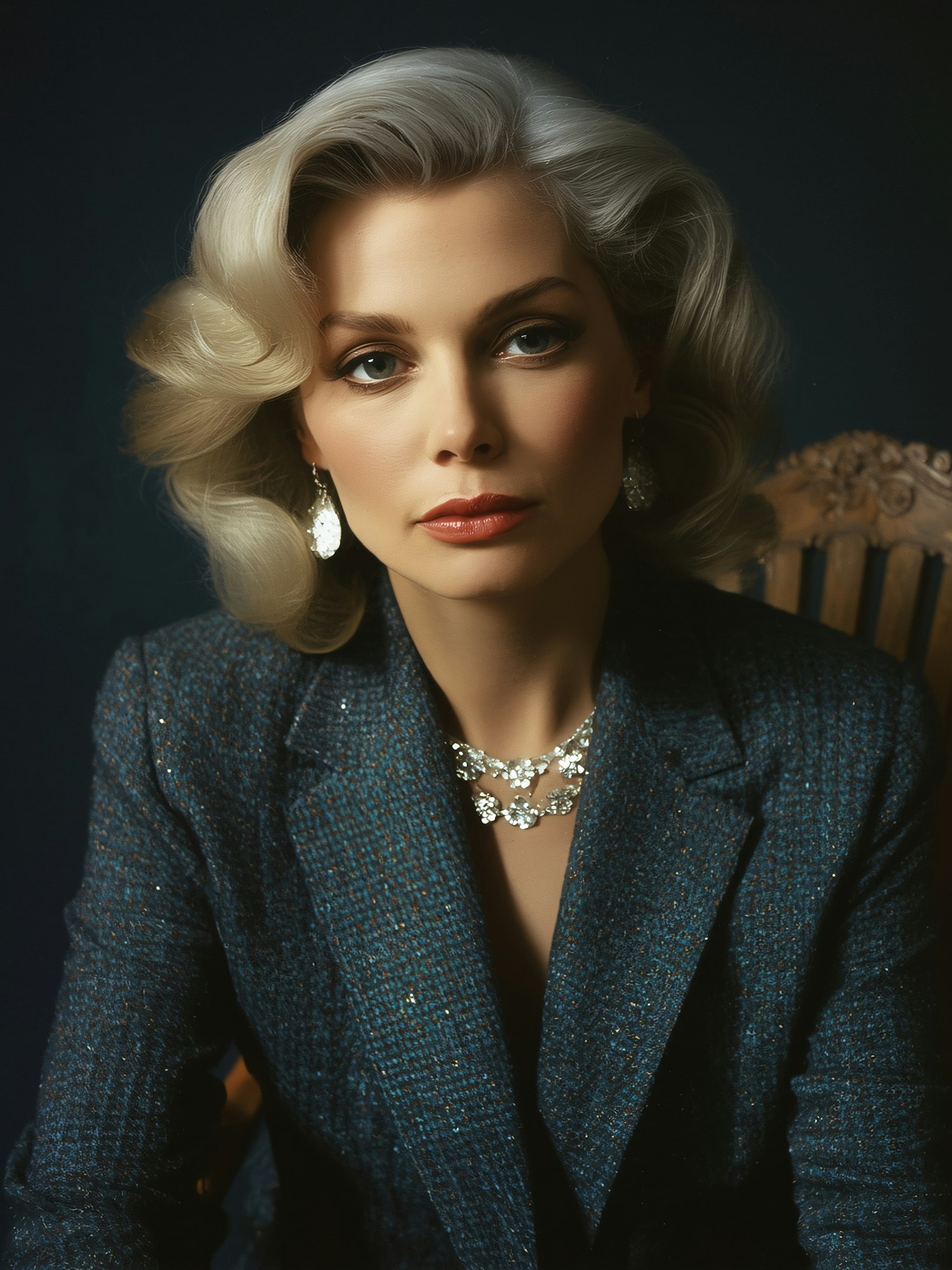 Elegant portrait of a woman with platinum blonde hair, wearing a blue blazer and diamond jewelry, set against a dark background.