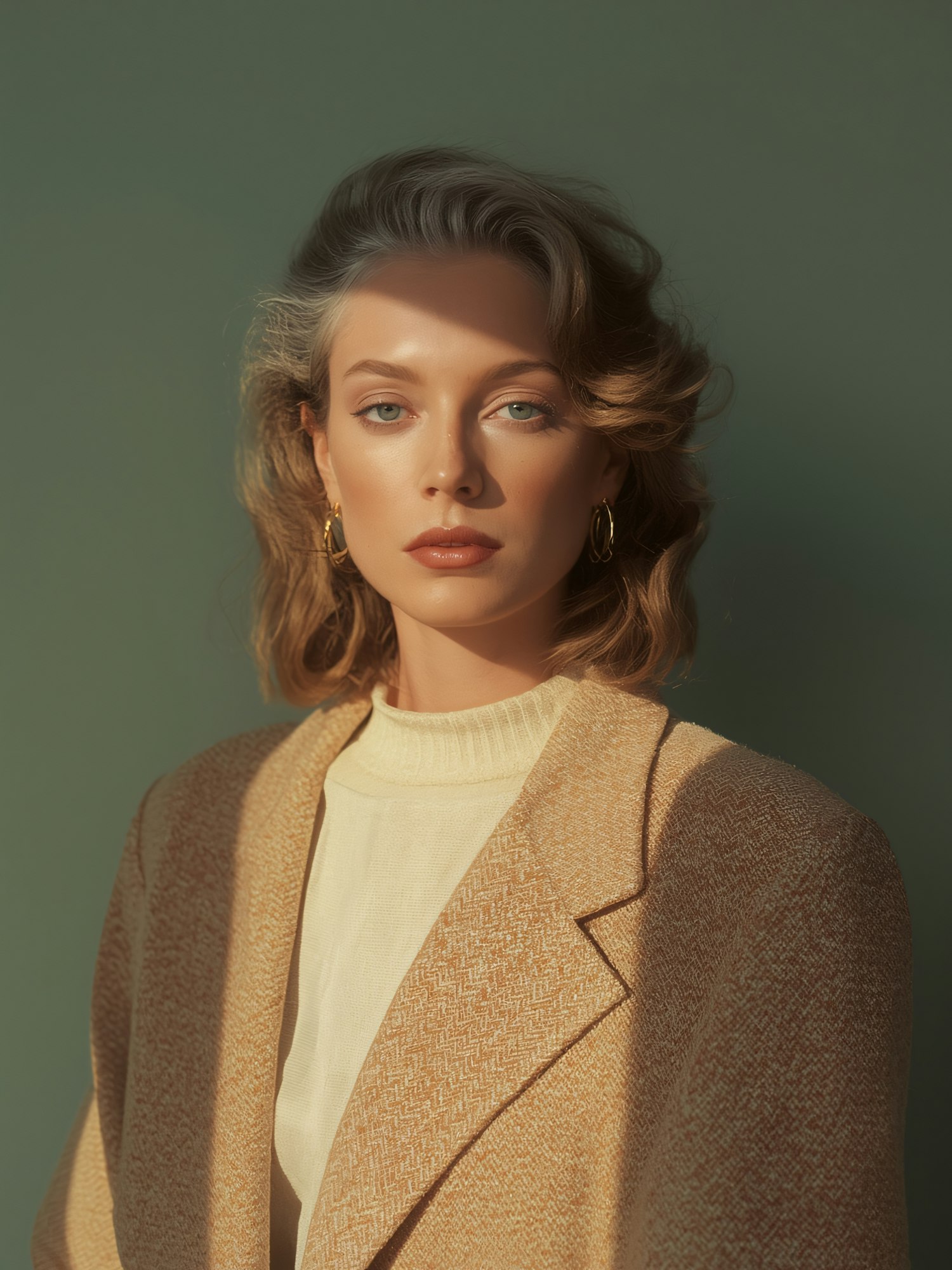 A woman in a beige blazer and cream sweater poses against a muted green background, with soft lighting highlighting her features.