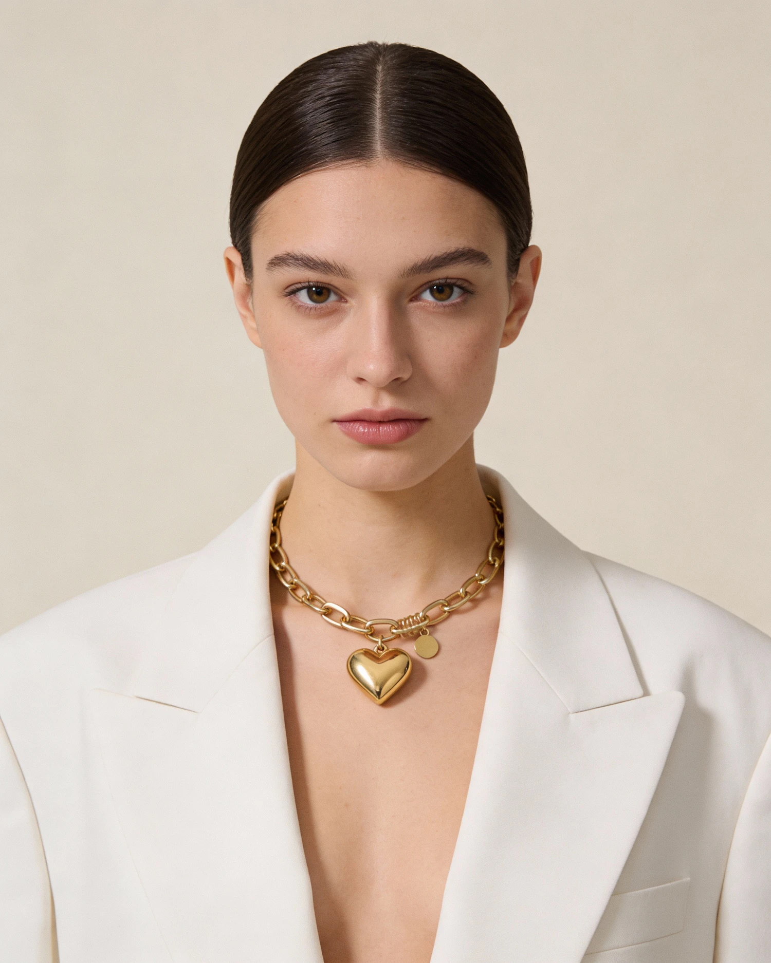 A woman in a white blazer and gold heart pendant necklace gazes directly at the camera against a neutral background.