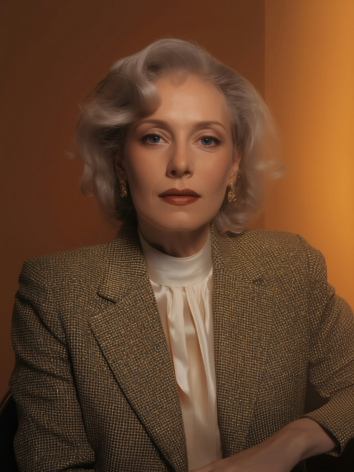 Elegant portrait of a woman with silver hair in a brown blazer and white blouse, set against a warm orange background.