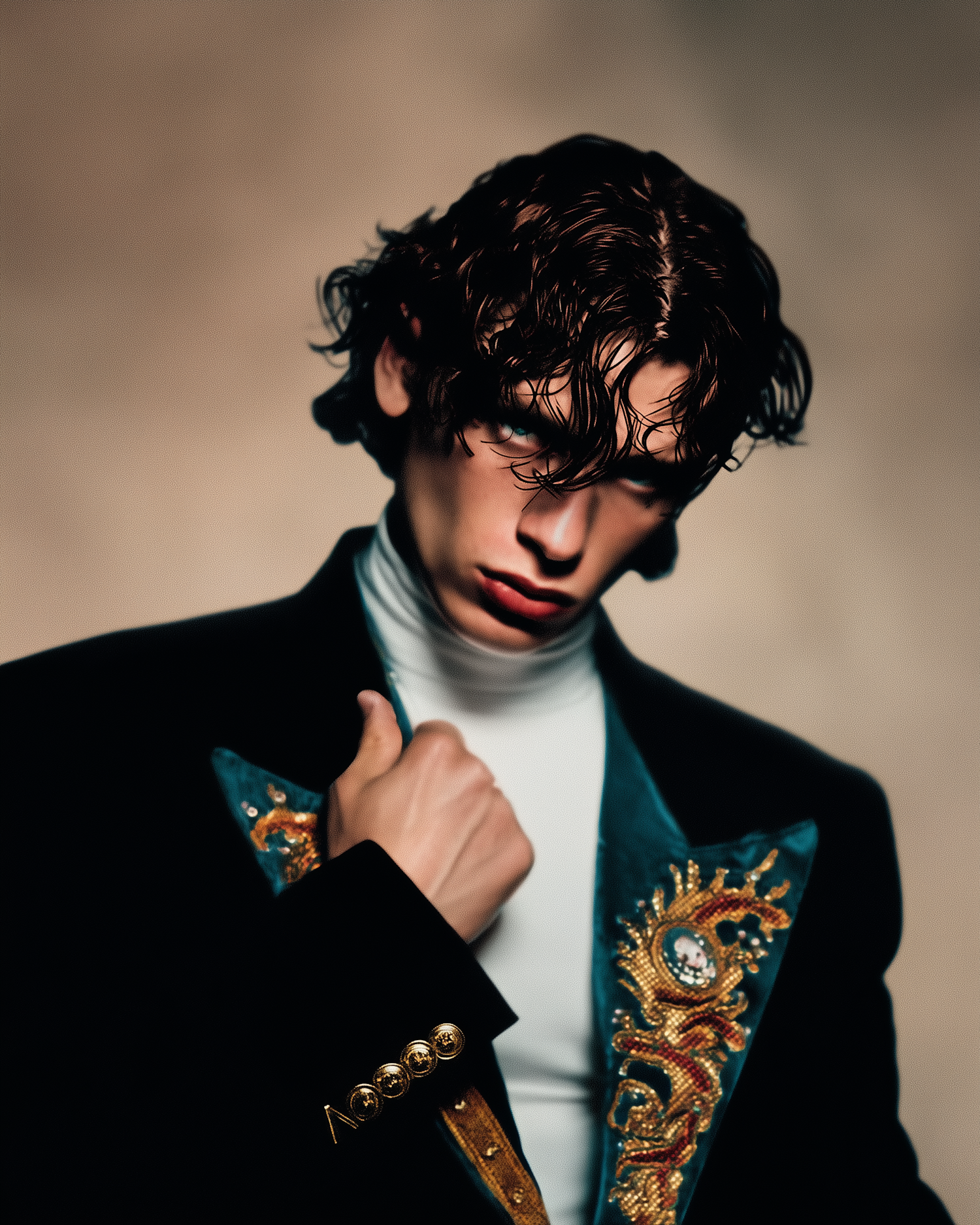 A close-up portrait of a person in a black jacket with gold embroidery and teal accents, exuding a dramatic and stylish vibe.