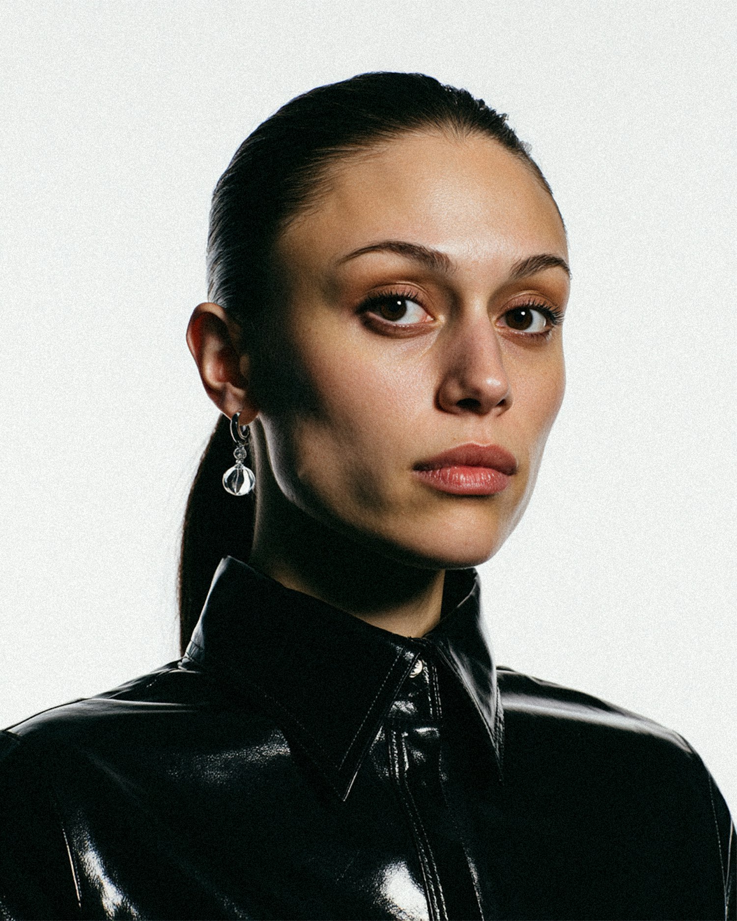 A striking portrait of a person in a black shiny outfit with a white background, showcasing elegance and simplicity.