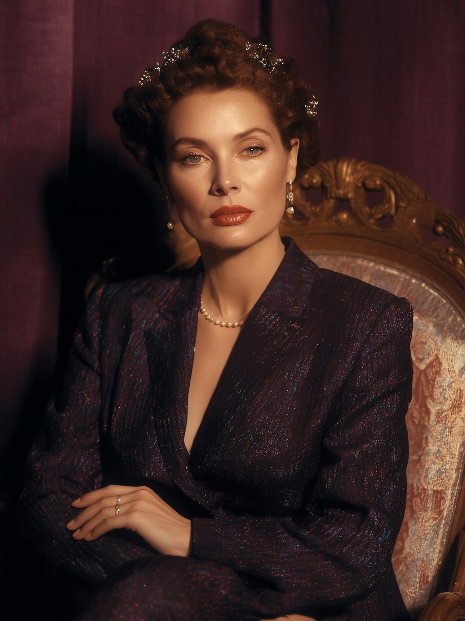 A poised woman in a shimmering suit sits in an ornate chair, with elegant accessories and a rich, warm-toned background.