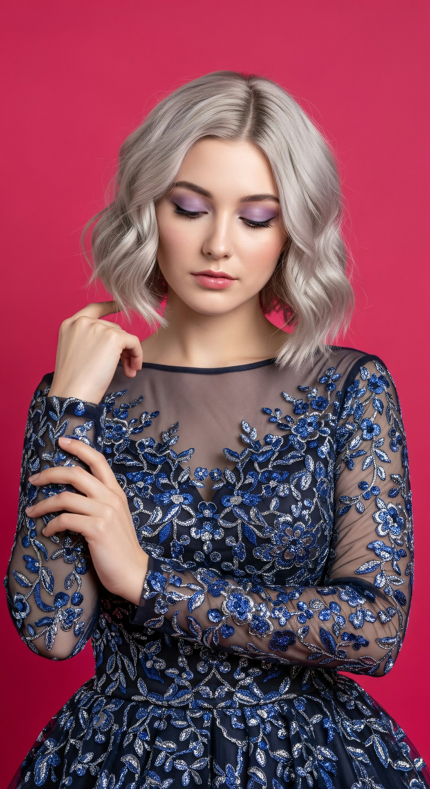 Elegant young woman with platinum blonde hair and intricate floral-patterned navy gown posing against a solid pink background.