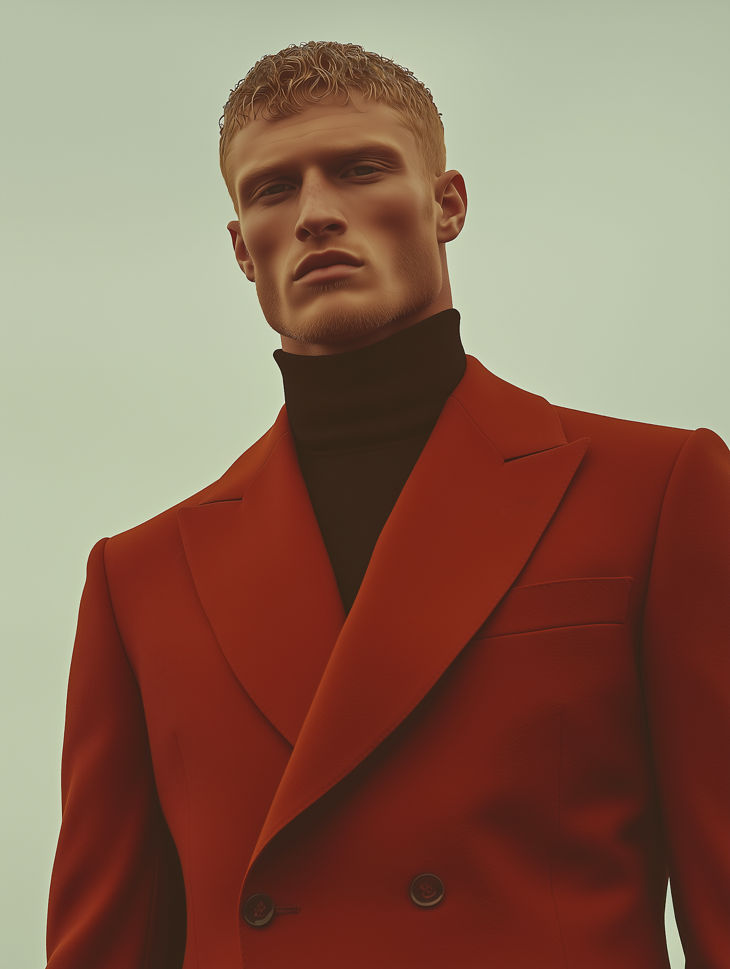 Stylish man in a red suit and black turtleneck against a pale green background, exuding confidence and modern elegance.