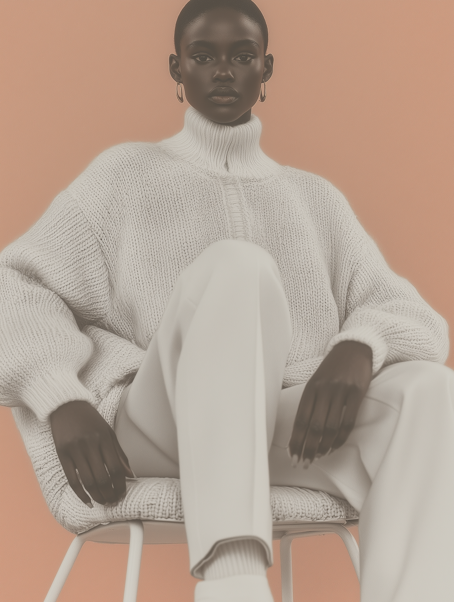 Stylish portrait of a person in white knitwear against a peach background, showcasing minimalistic fashion and serene elegance.