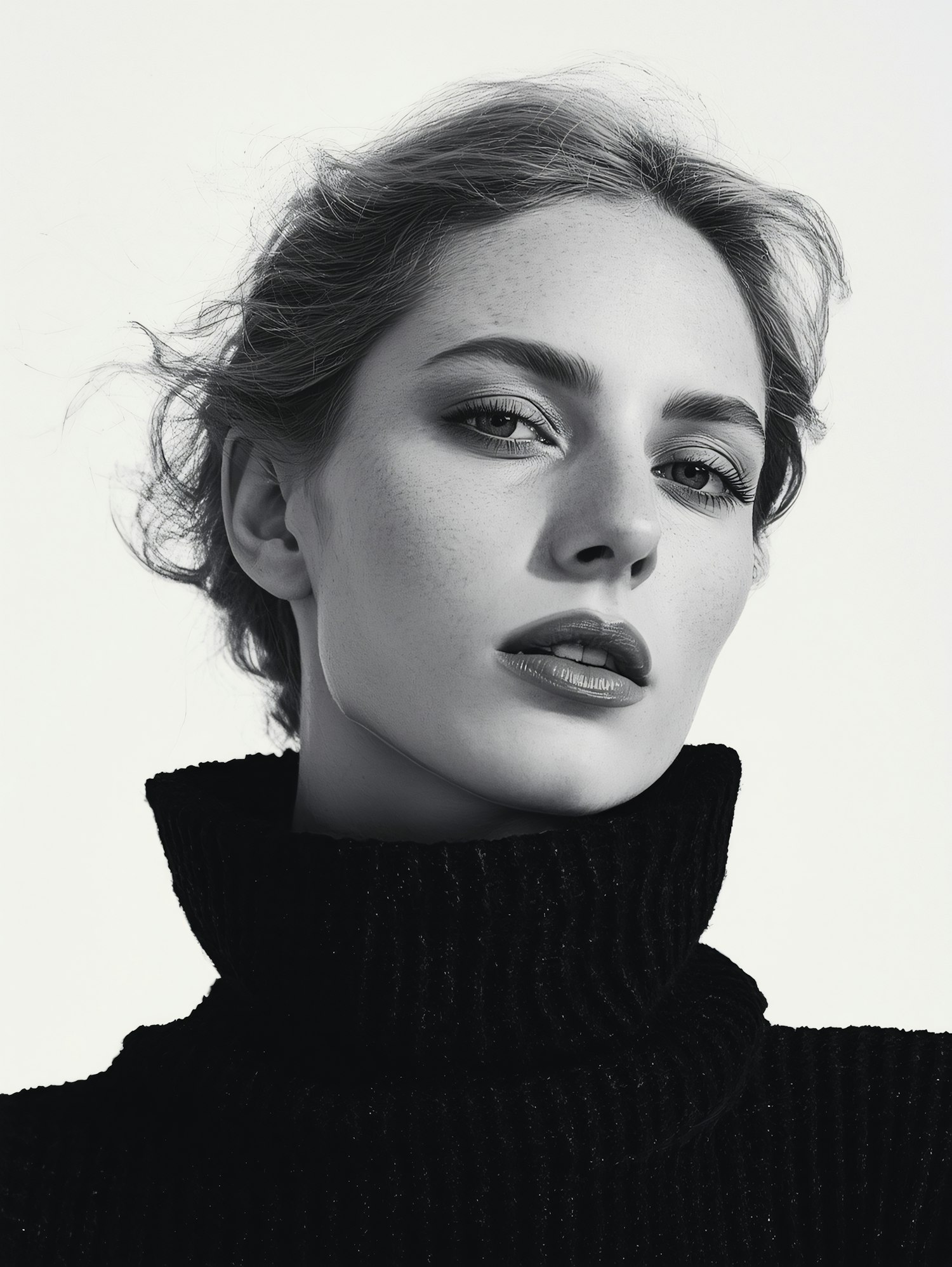 Black-and-white portrait of a woman in a textured black sweater, showcasing dramatic lighting and elegant composition.