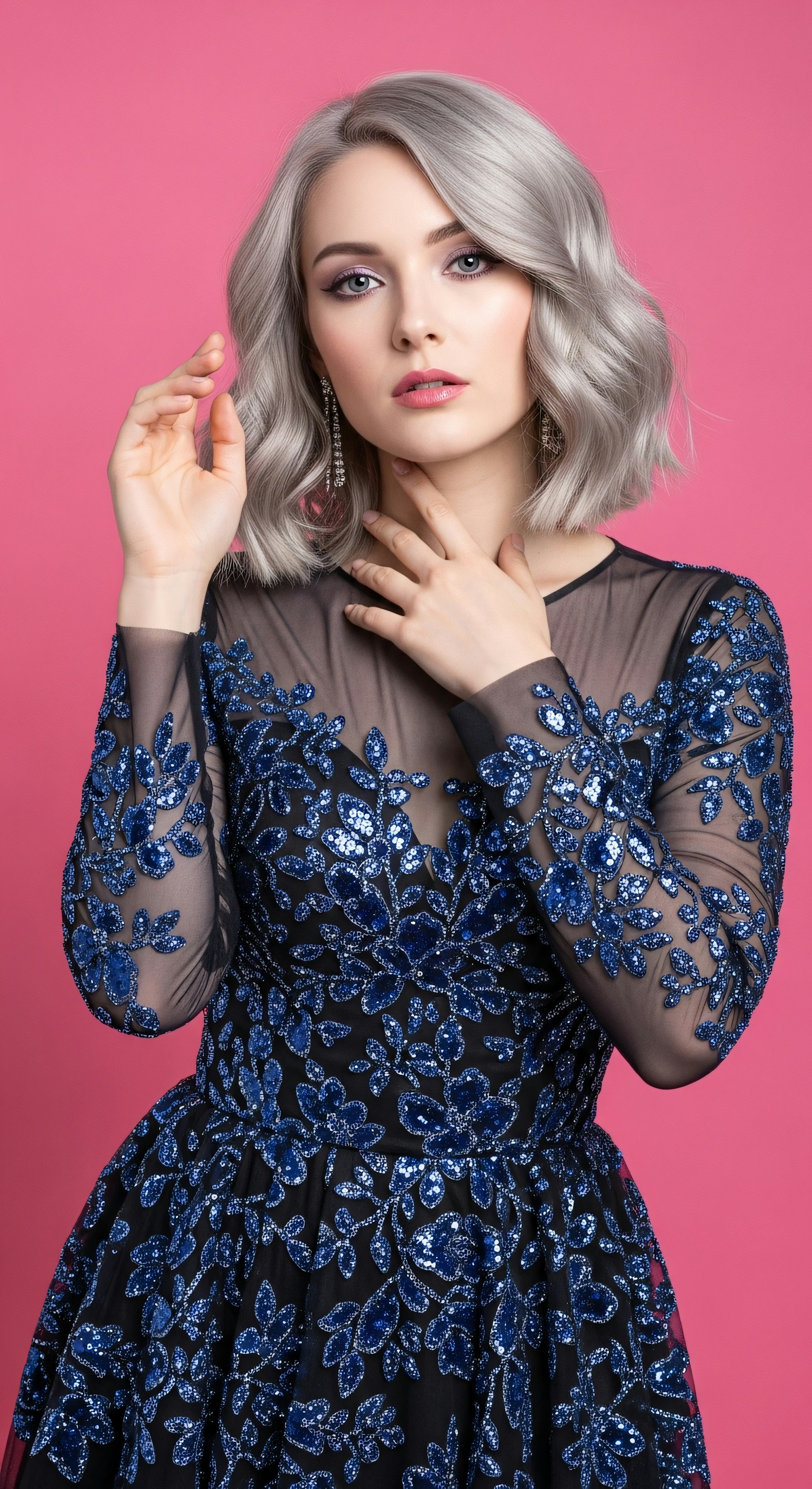 Elegant individual dressed in a dark floral-patterned outfit with wavy, light hair, posed against a vibrant pink background.