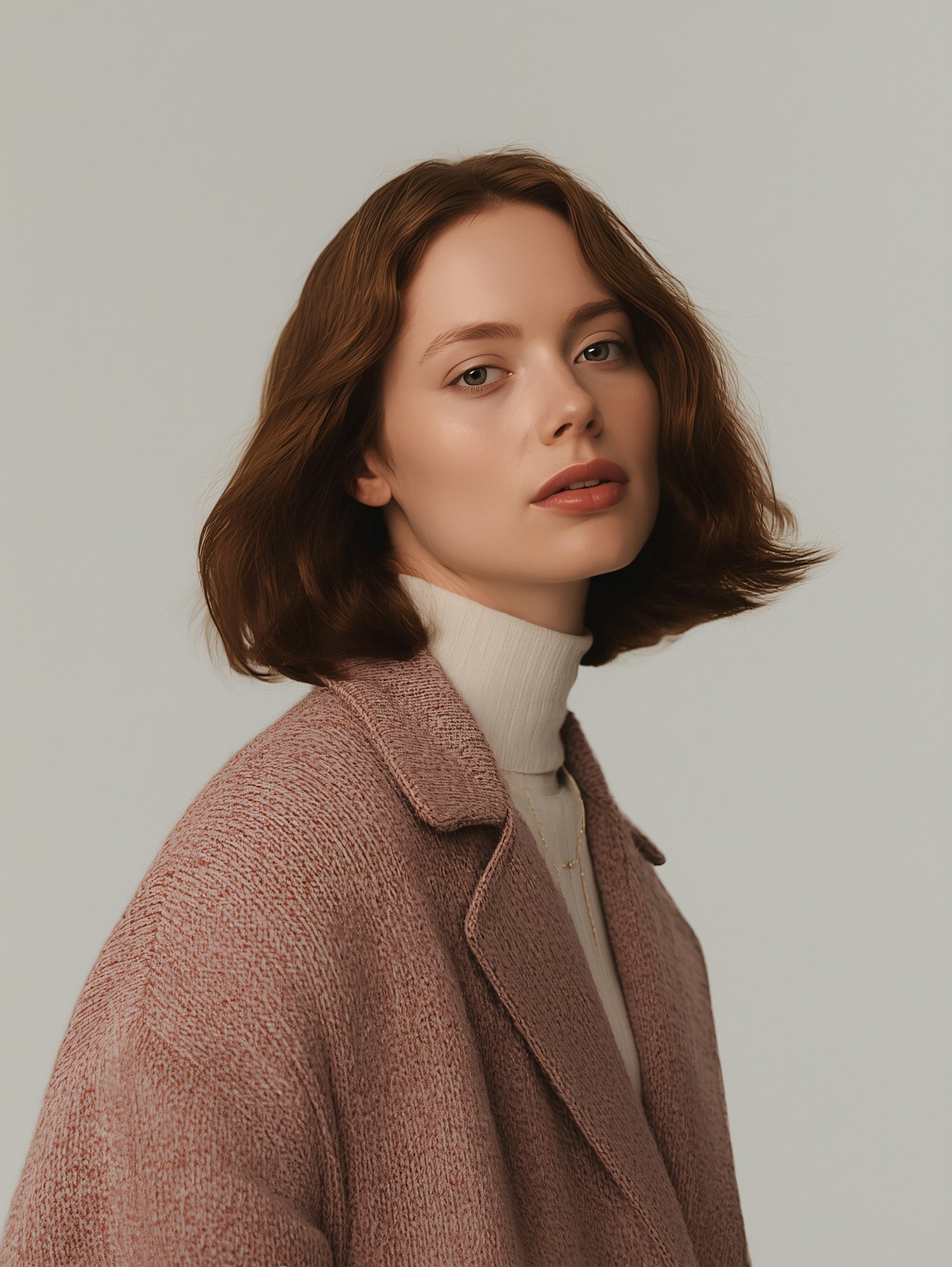 A young woman with light brown hair in a pink coat and white turtleneck, set against a neutral background, exudes a minimalist elegance.
