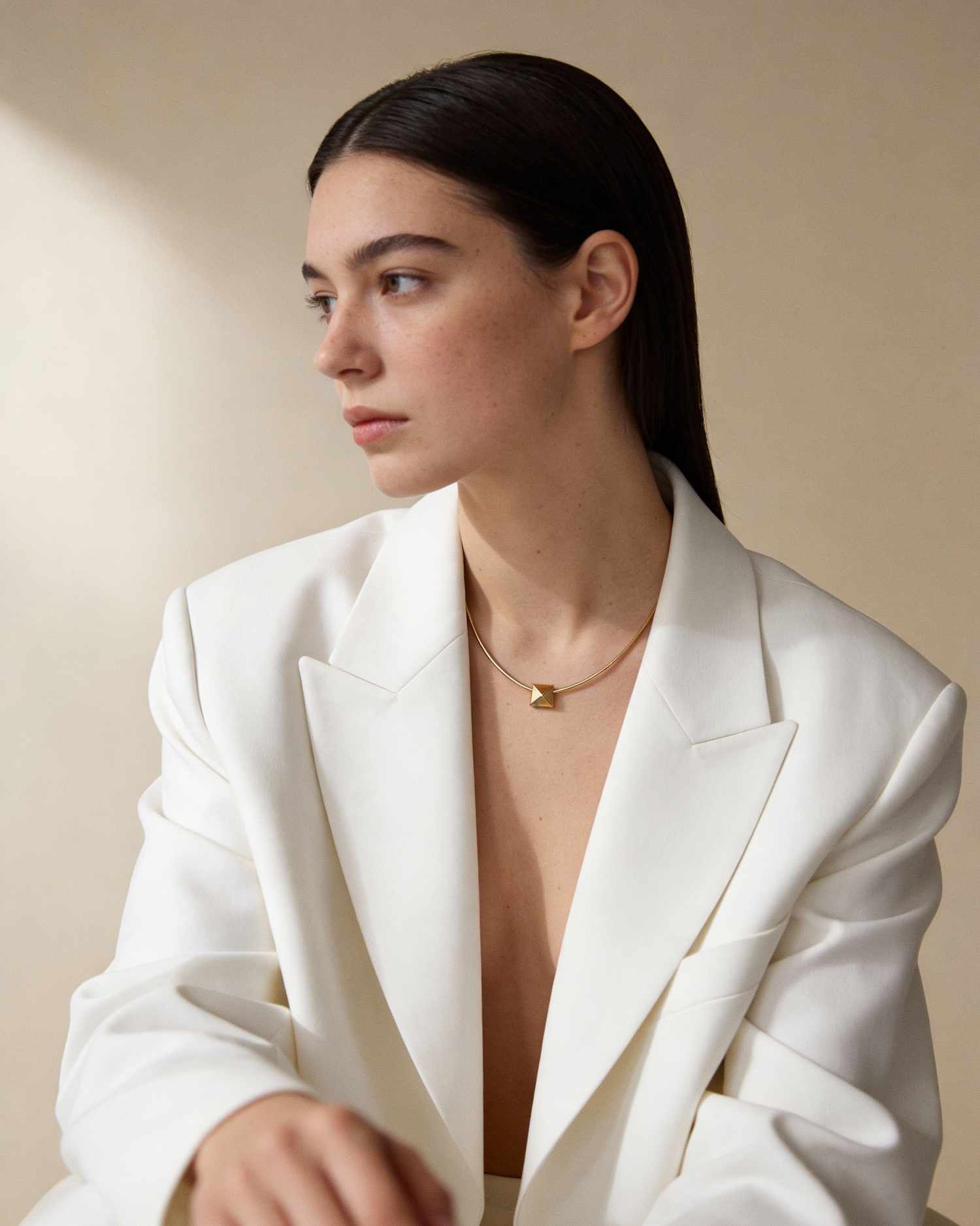 A woman in a white blazer and gold necklace gazes thoughtfully to the side, set against a neutral background.