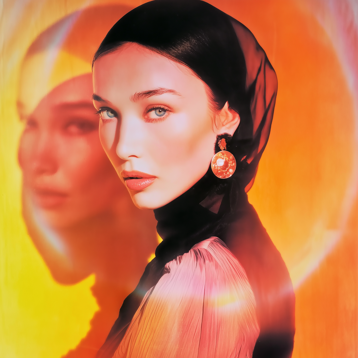 A striking portrait of a woman in a black headscarf and pink blouse, with ornate earrings and a glowing orange background.