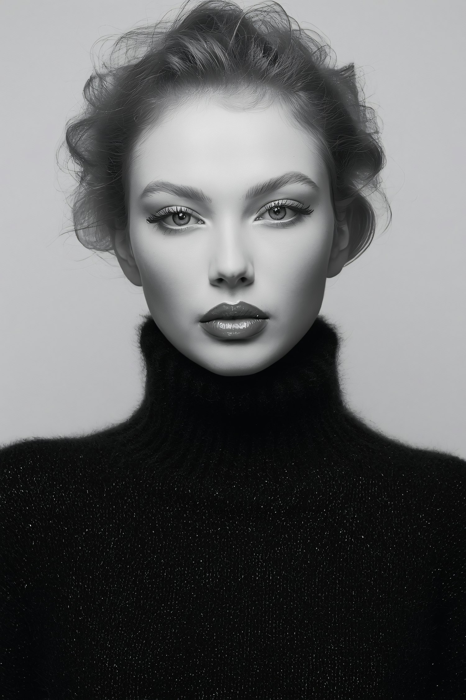 Monochromatic portrait of a person with styled hair and a black turtleneck, showcasing elegant features and a minimalistic aesthetic.