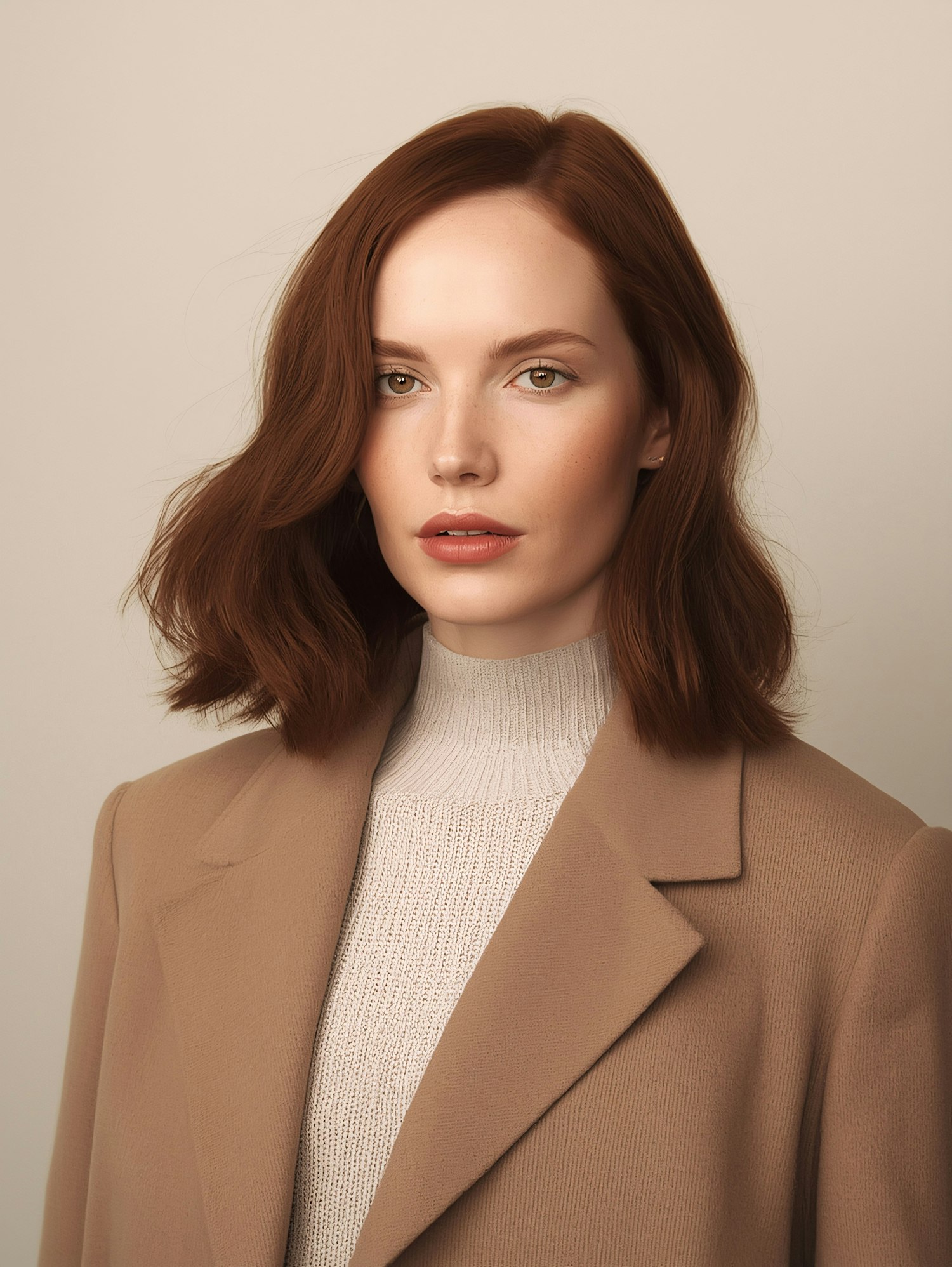 A woman with auburn hair and a beige coat poses against a neutral background, showcasing a minimalist and elegant style.