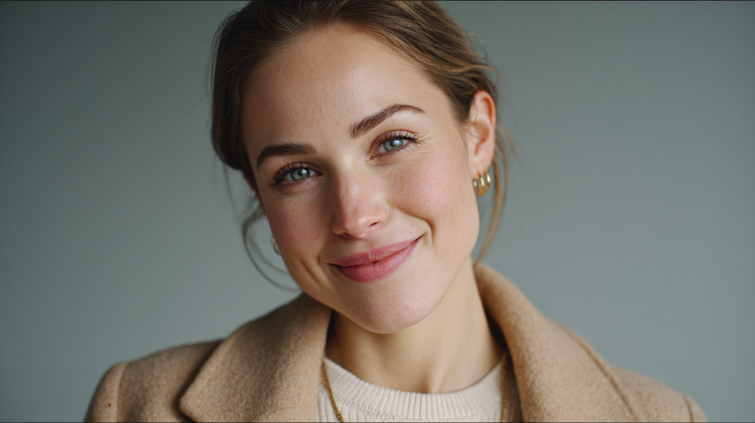 Close-up portrait of a person with blue eyes and light brown hair, wearing a beige coat and gold accessories against a gray background.