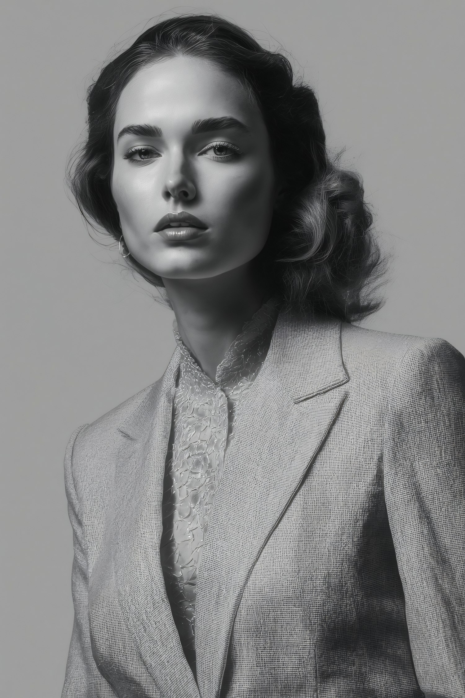 Grayscale portrait of a woman in a textured blazer and lace blouse, showcasing elegance and professionalism.