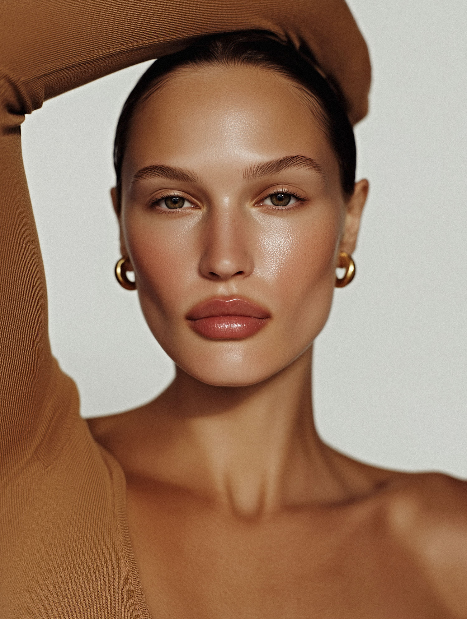 Close-up portrait of a person with glowing skin, gold hoop earrings, and a neutral expression against a plain background.