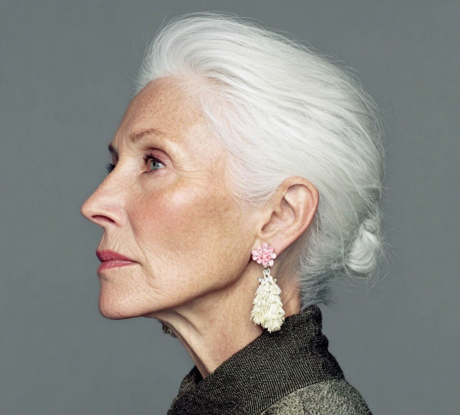 Profile of an older individual with white hair in a bun, wearing pink floral earrings and a high-necked outfit against a gray background.