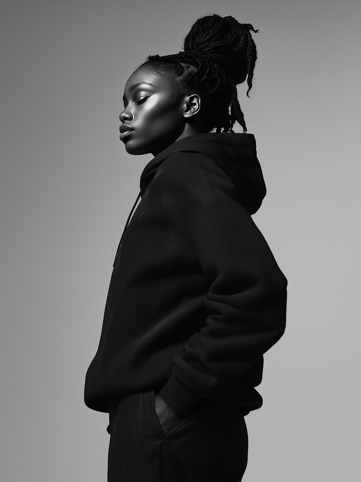 Black-and-white portrait of a person in a hoodie, showcasing dramatic lighting and a confident pose against a minimalistic background.